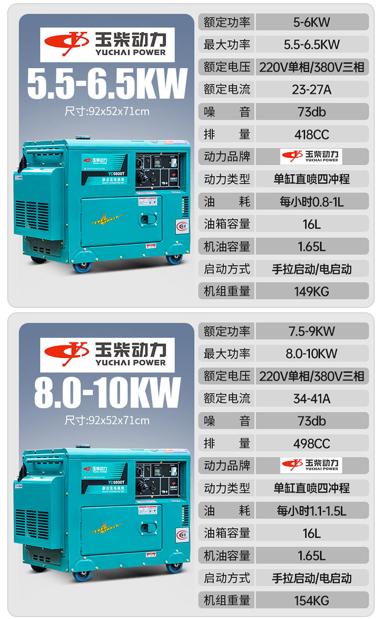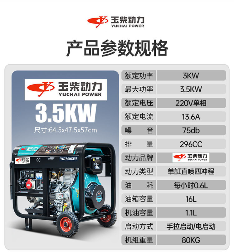 玉柴5/6KW柴油发电机220V/380V可选 开架 静音家用 电启动 发电机