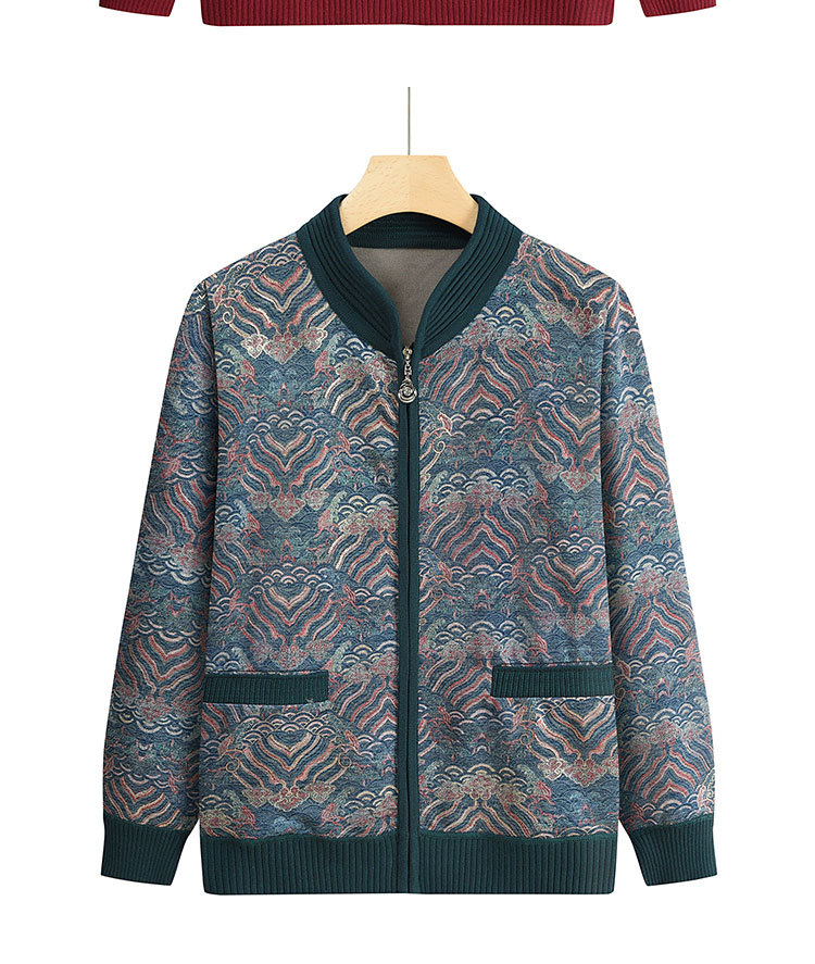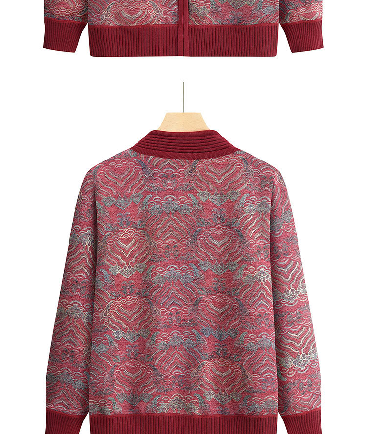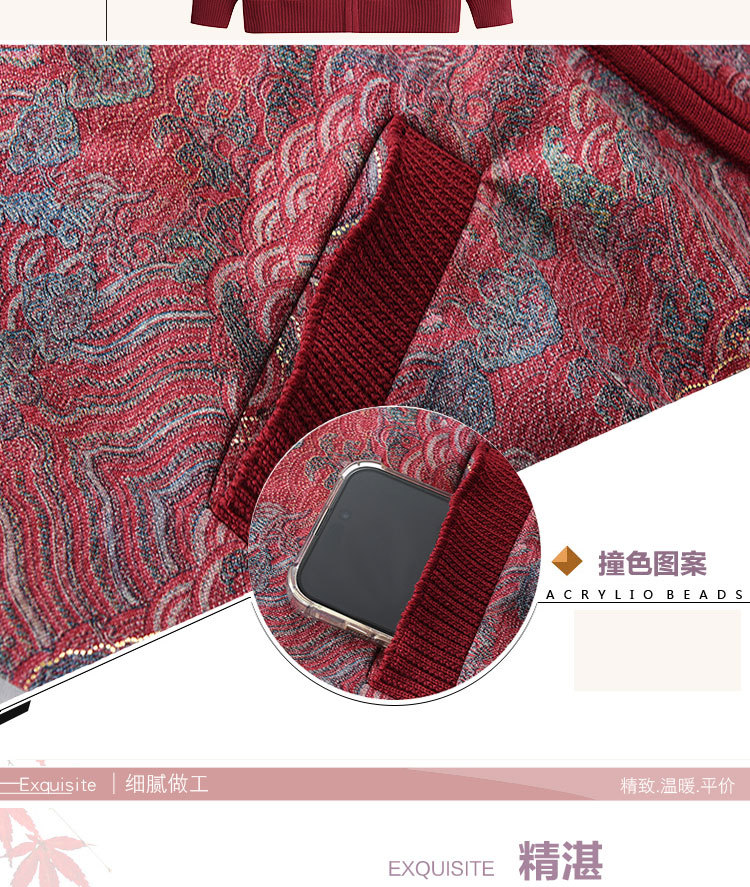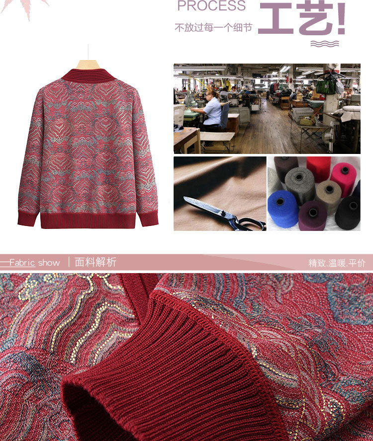 中高年のお母さんの秋冬ニットのカーディガンのおばあさんのセーターの丸首のプリントのゆったりとしたカジュアルで快適な女性のセーター