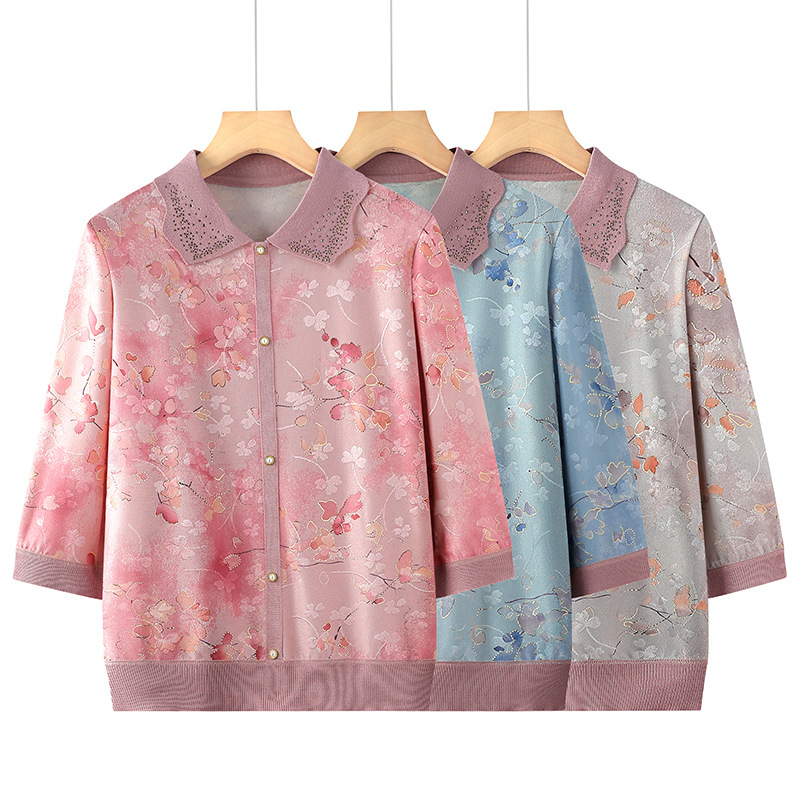 お母さんの春の服の新しい中国式の薄いタイプのニットの小さいシャツの中高年の春秋の国の風の氷の糸の長袖のtシャツの上着