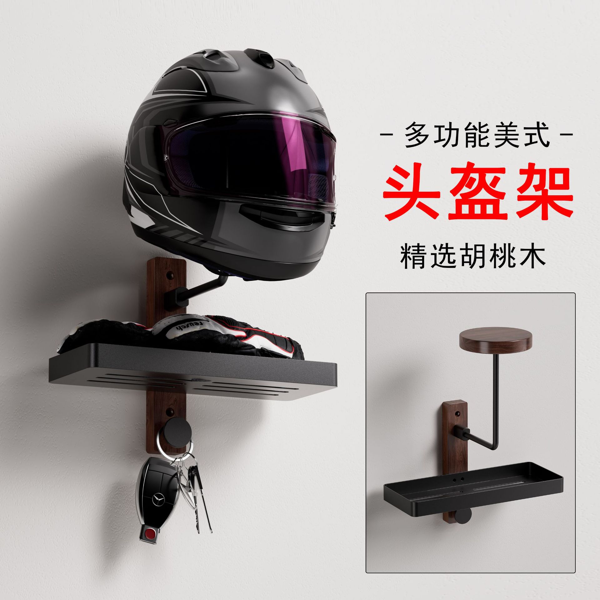 跨境新品胡桃木头盔收纳架实木挂钩壁挂式头盔架摩托车帽子置物架