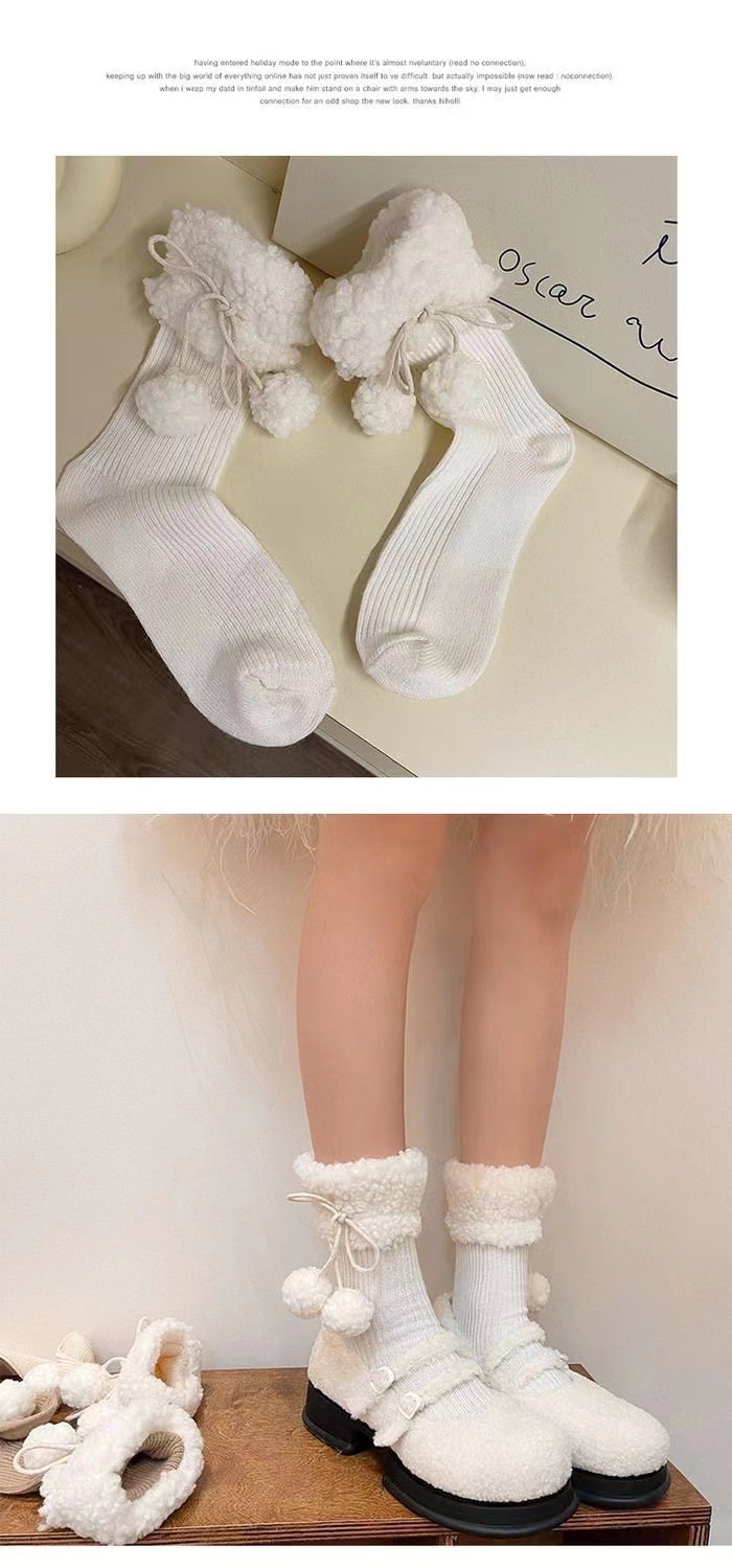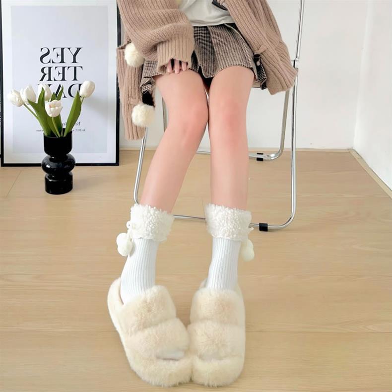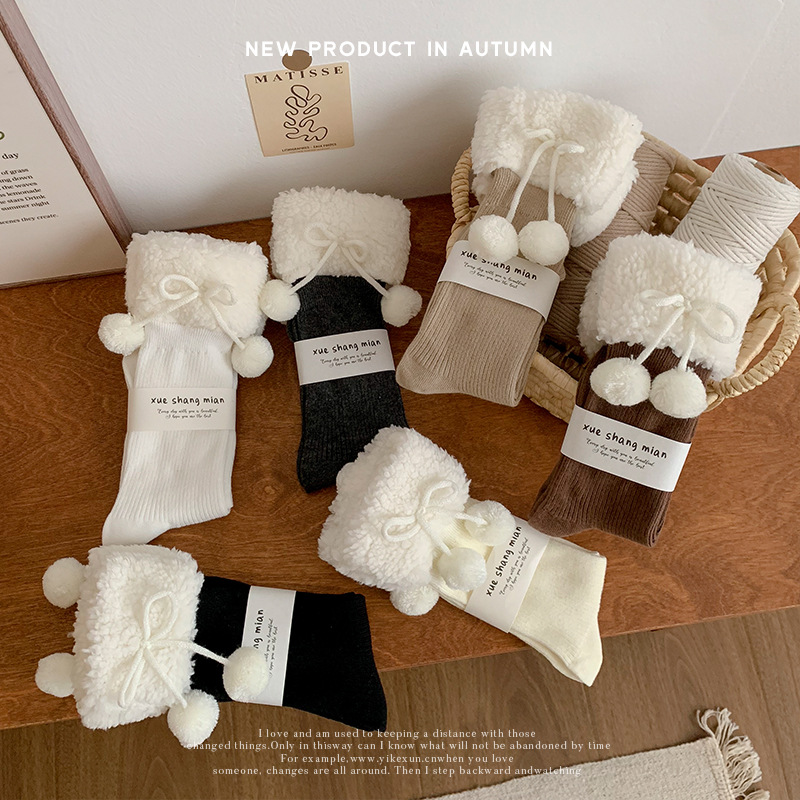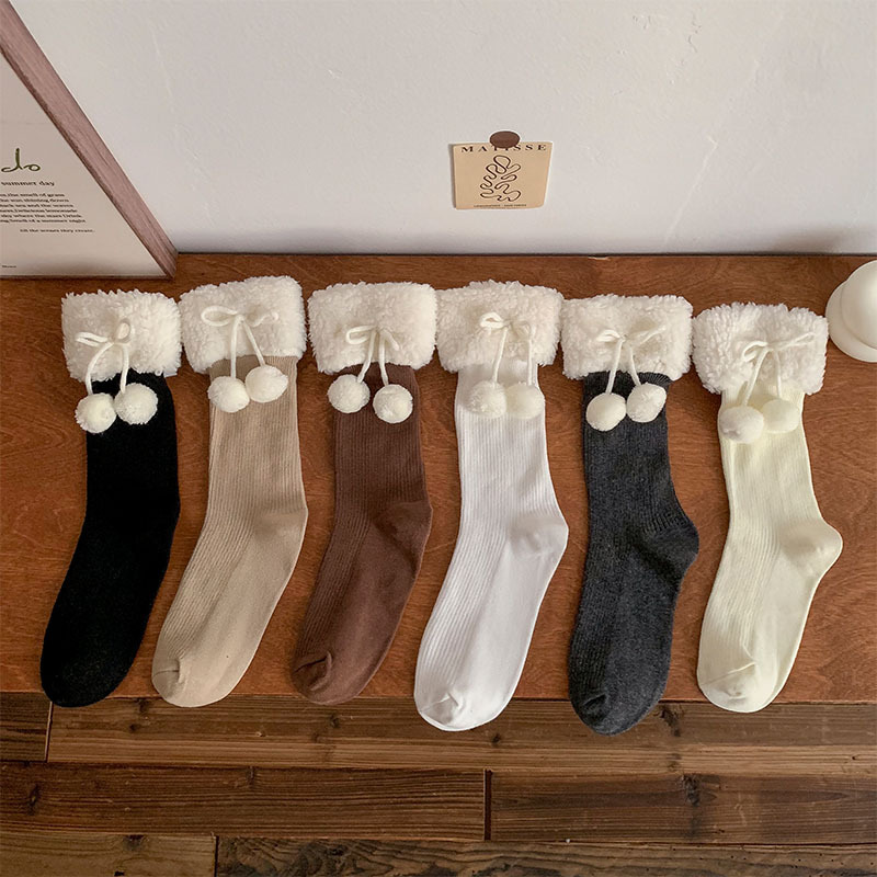 秋冬の新型の柔らかいモチモチ毛玉のぬいぐるみの靴下の靴下の山の靴下のかわいい保温の百合jkの中筒の靴下のミルクの白色