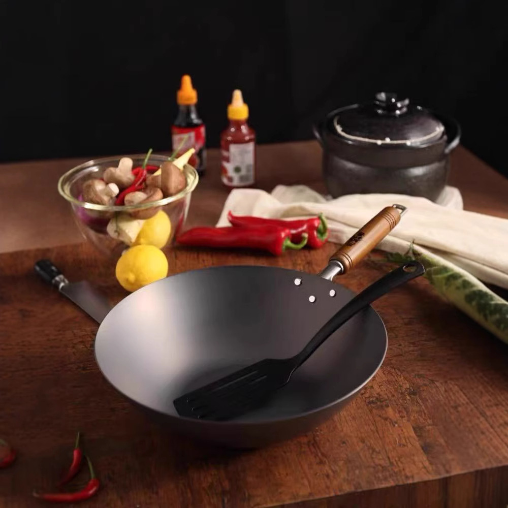 頼川日本オリジナル輸入鉄鍋中華鍋業務用木製ハンドル丸底コーティングされていない油煙の少ないプロのシェフ鍋