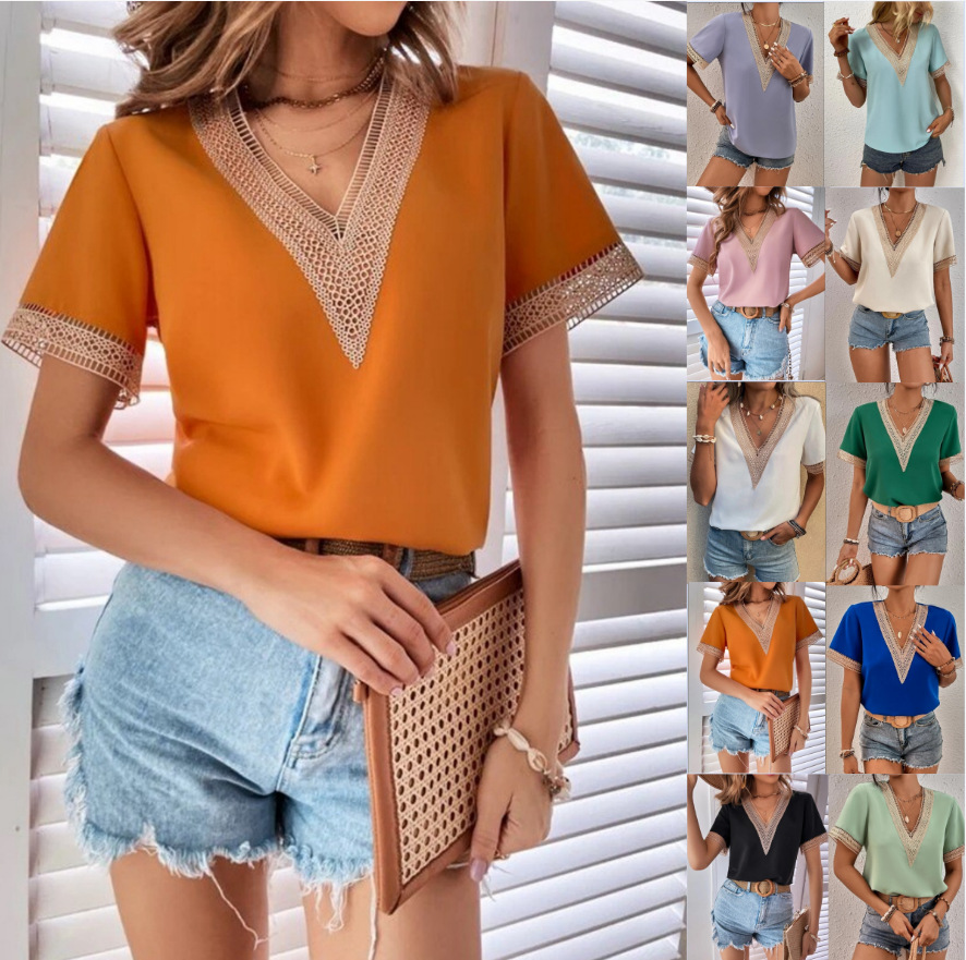 夏の新しいAmazonウィッシュヨーロッパとアメリカのクロスボーダー婦人服Vネックレースカジュアル無地シャツクロスボーダースポット