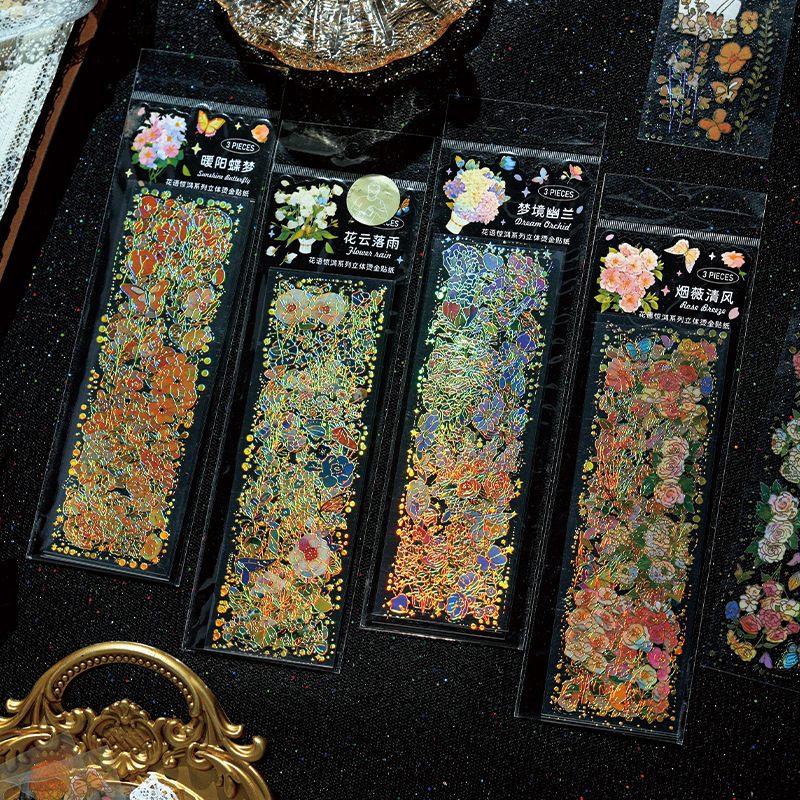 防水PET立体烫金贴纸ins风小清新蝴蝶花卉咕卡装饰手帐贴画高颜值