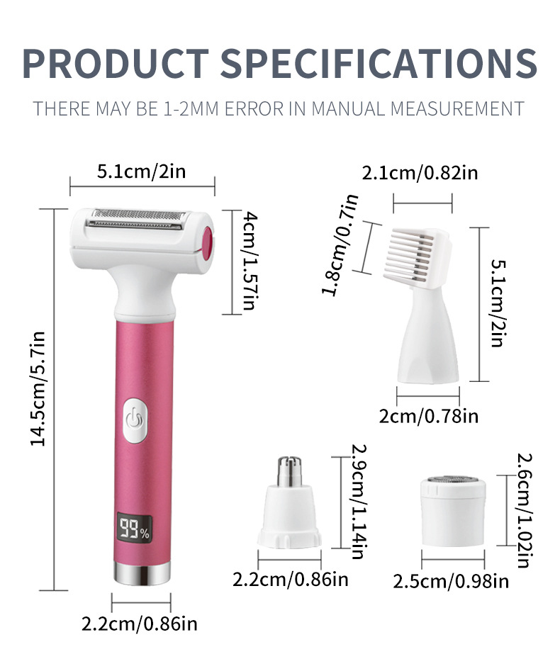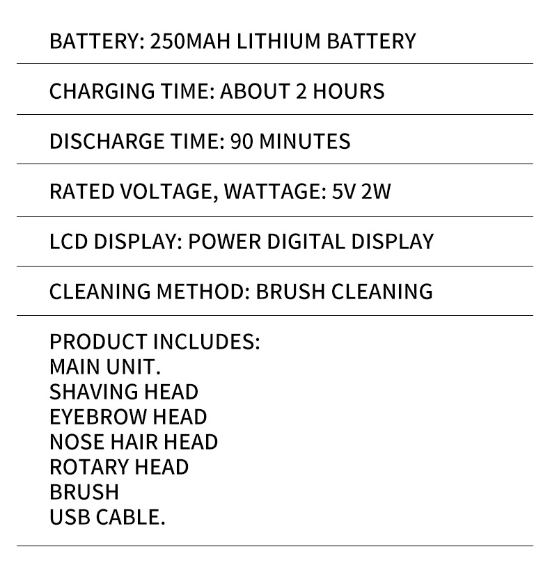 【产品包含】:主机,剃毛头,鼻毛头,修眉头,USB充电线,毛刷,说明书