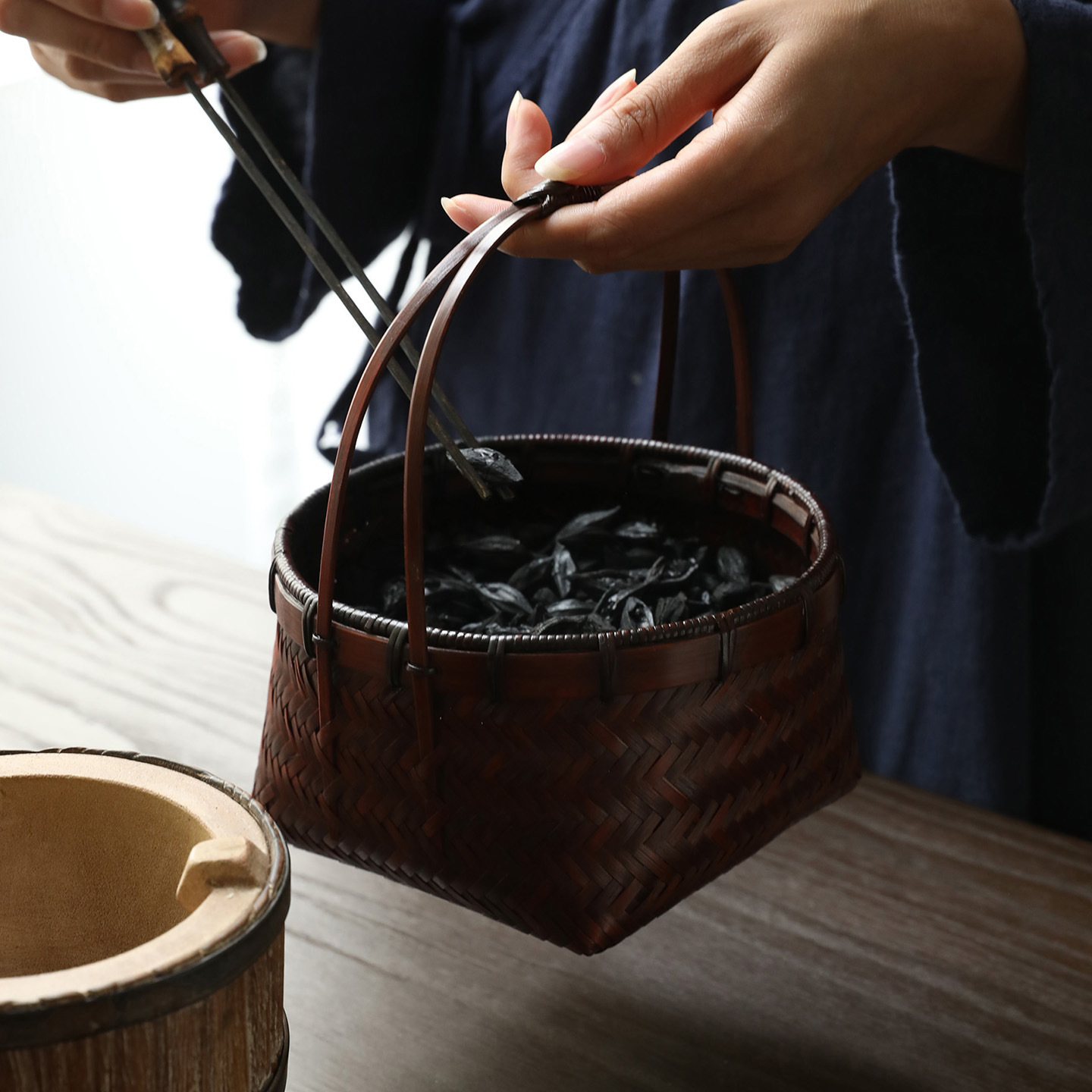 竹益堂煴梁竹编提箩碳筐做旧手工茶室木炭收纳篮炭篓配件装炭桶