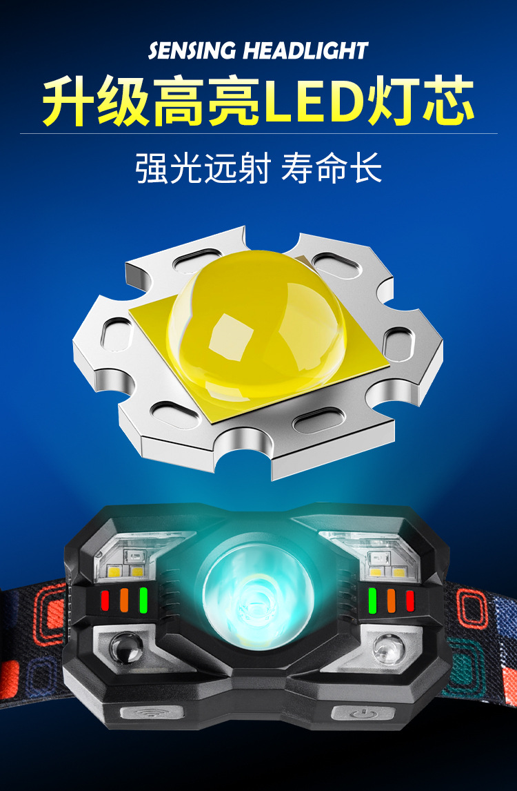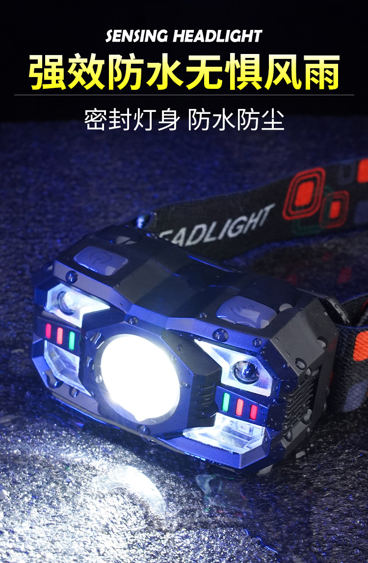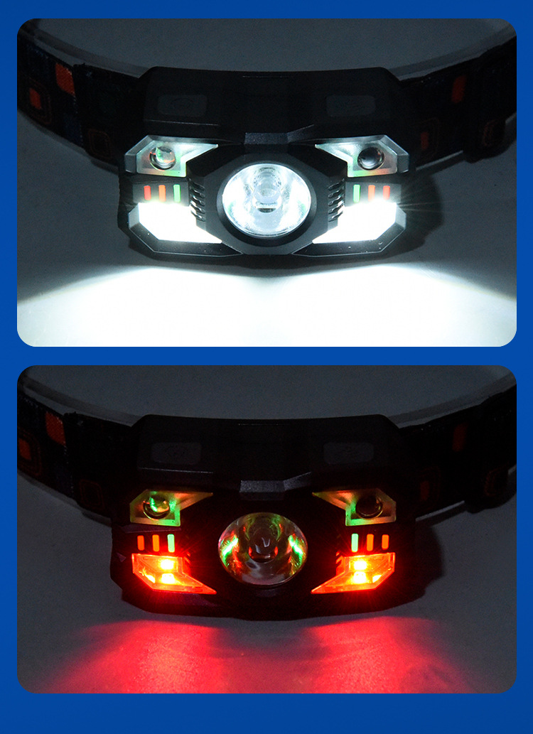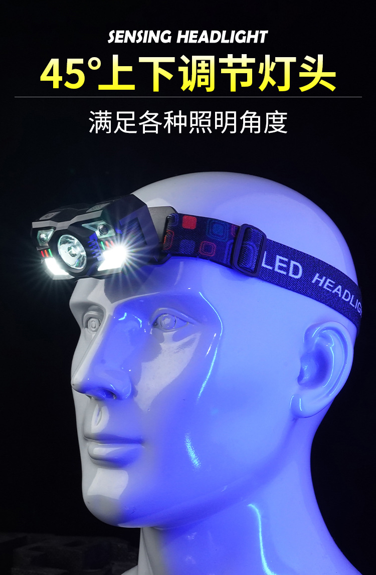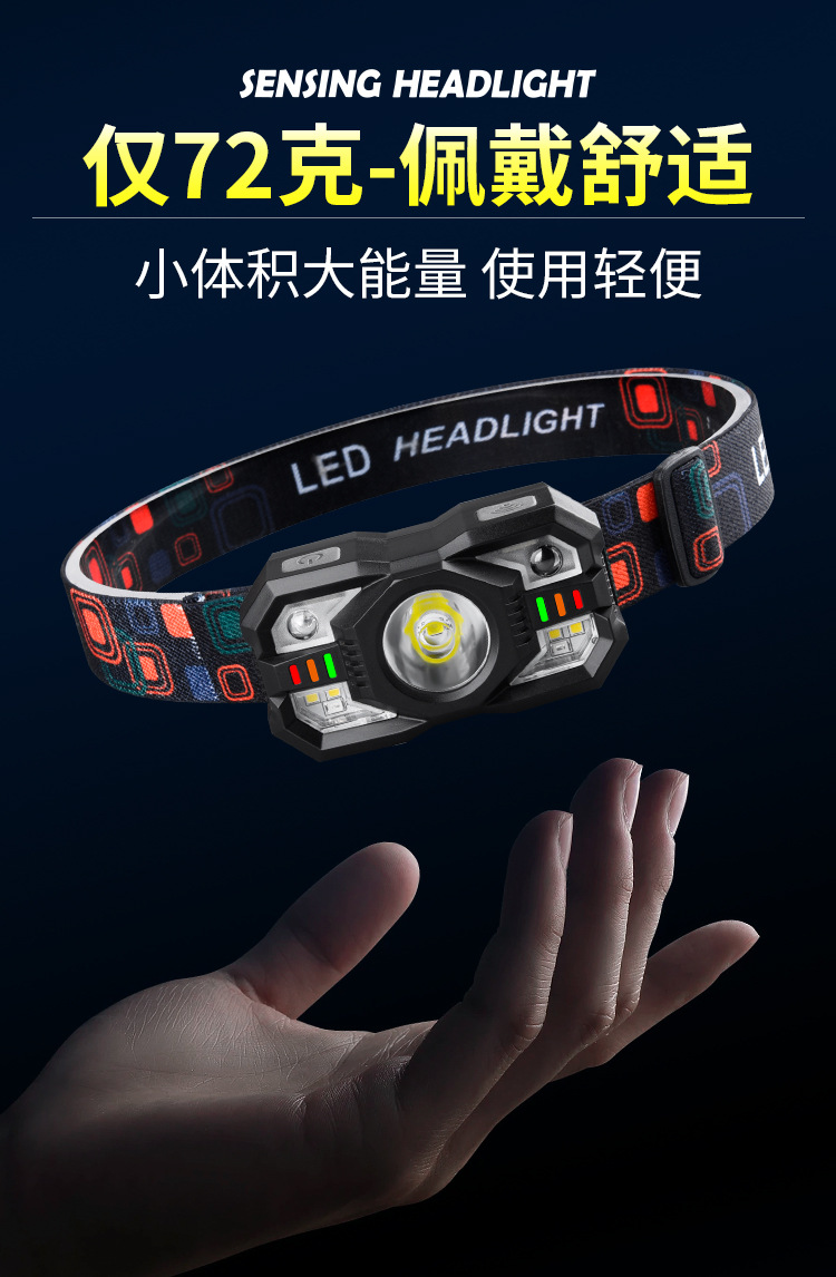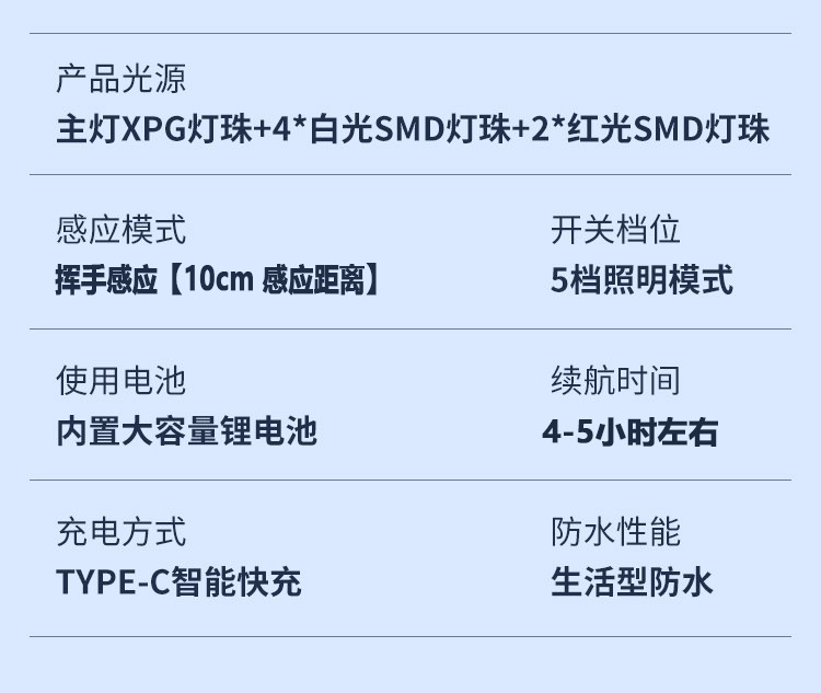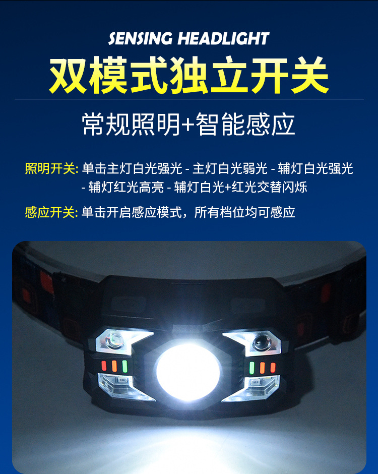 【其他功能】红白双光源,5档感应,远近光源,迷你便携