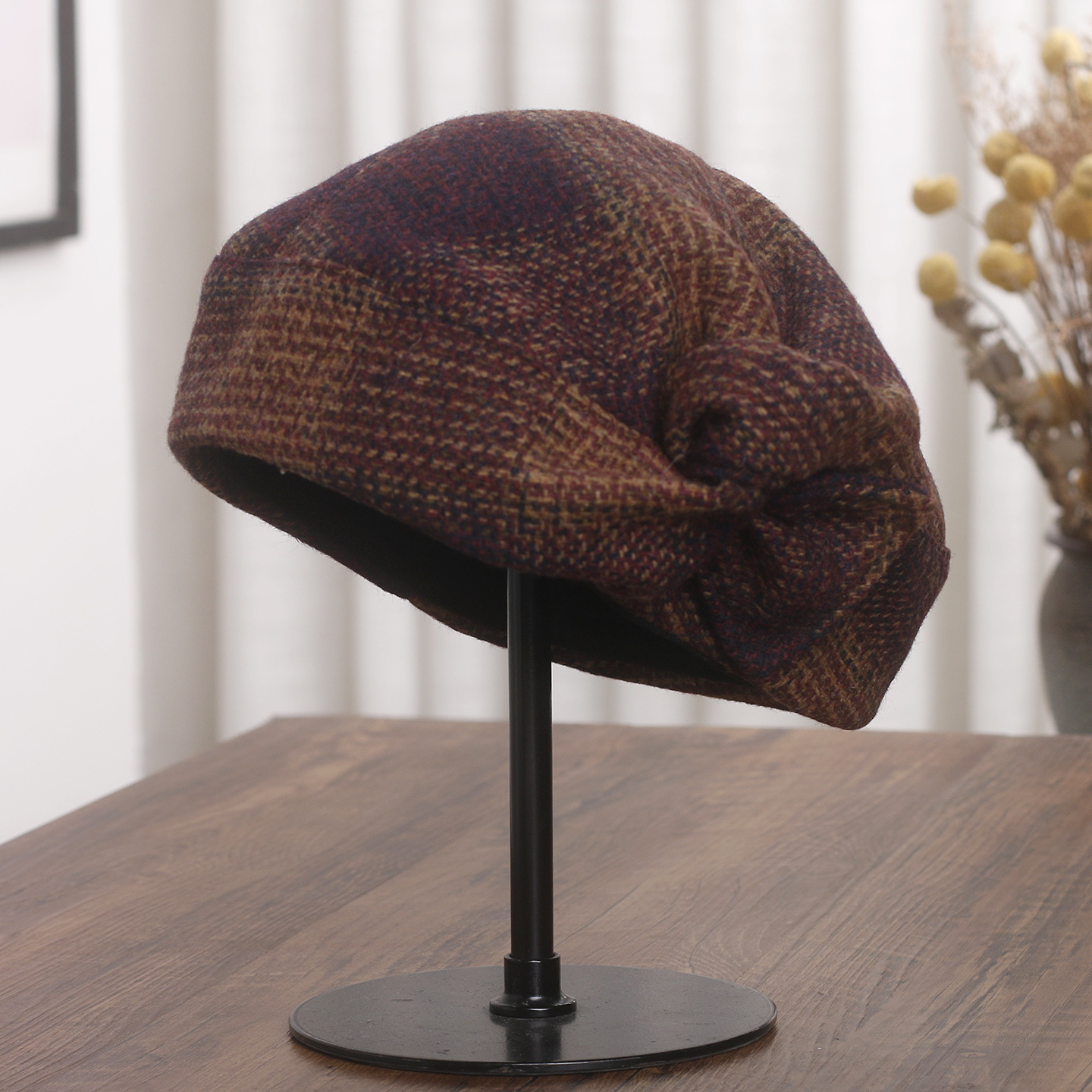 帽子女秋冬羊毛贝雷帽保暖韩版百搭时尚扭结蓓蕾帽复古格纹画家帽