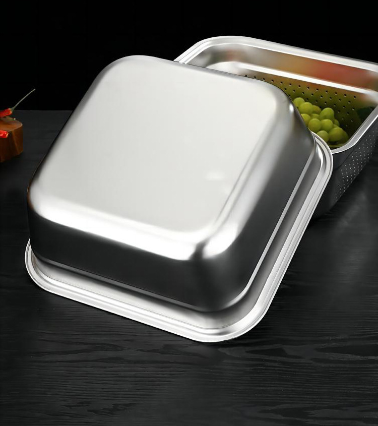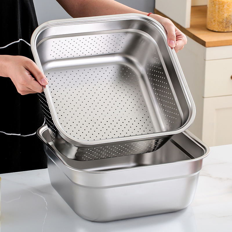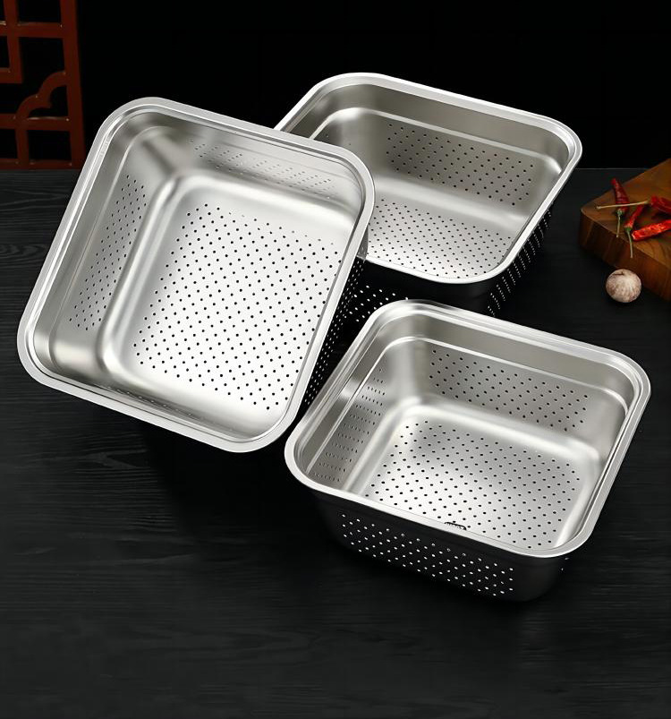 ステンレスの四角いたらいの正方形の野菜を洗うたらいの四角いふるいは穴をあけてたらいを濾過します。