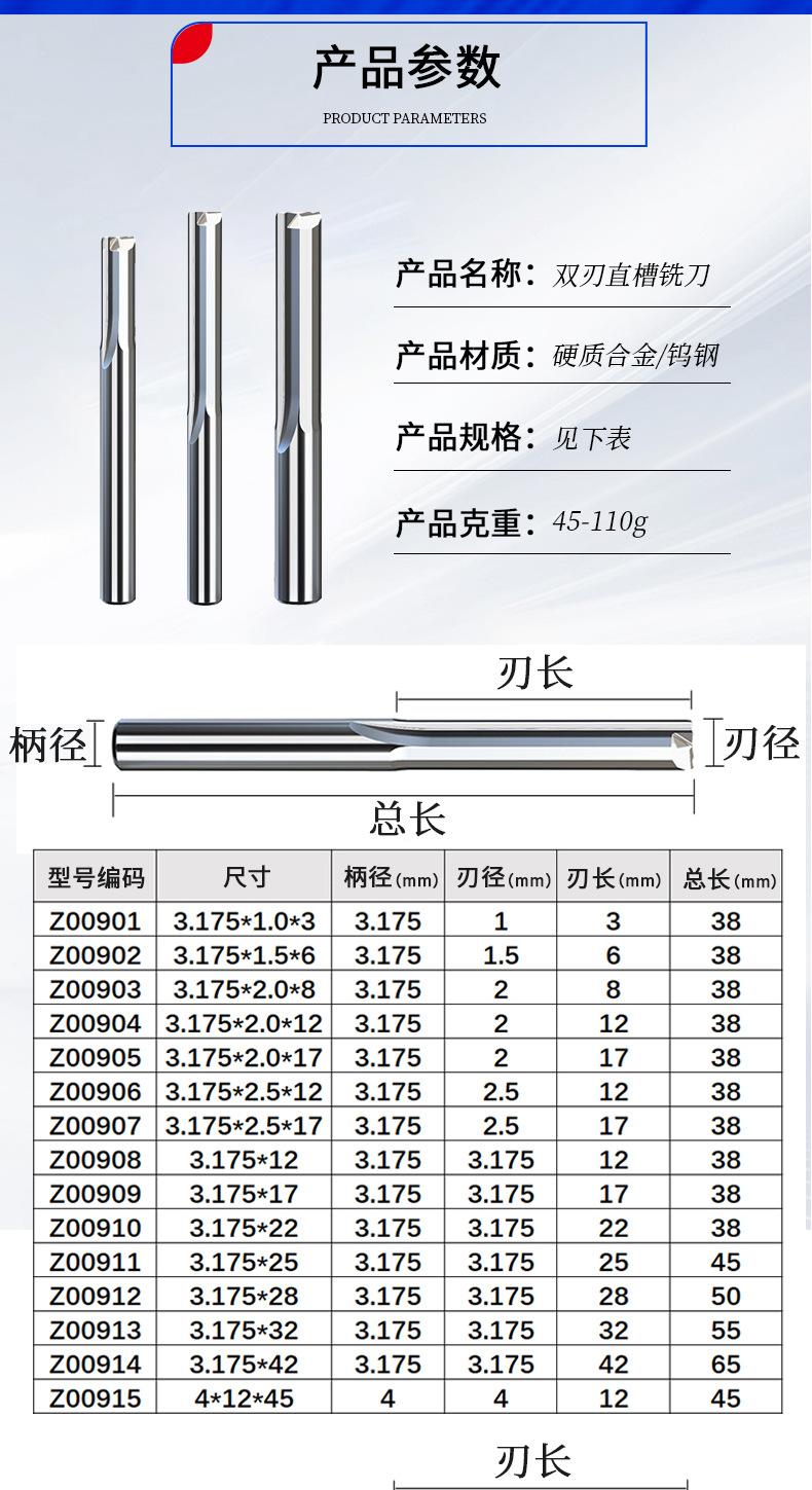 3.175双刃直槽钨钢铣刀 密度板 实木夹板雕刻机切割刀具 雕刻刀