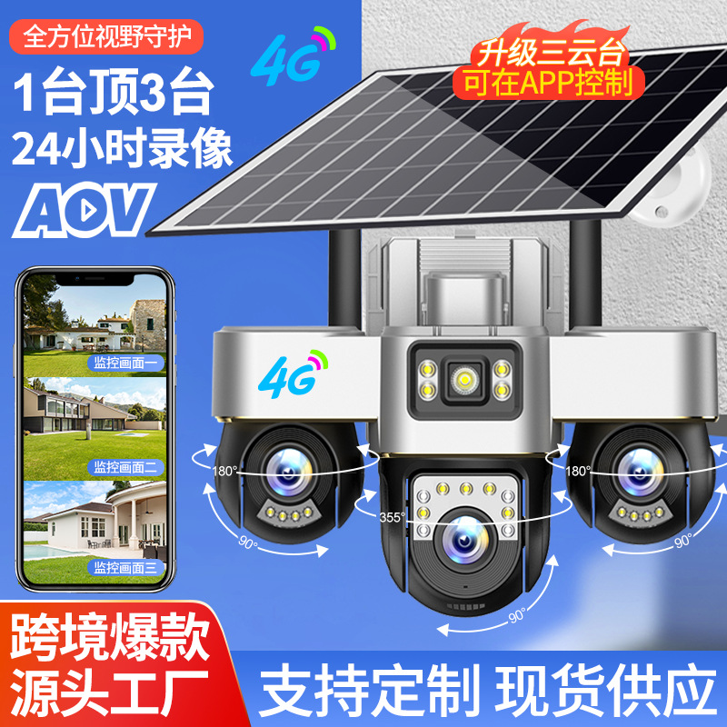V380pro摄像头AOV太阳能电池4G家用24小时录像户外防水三画面监控