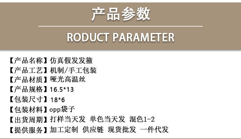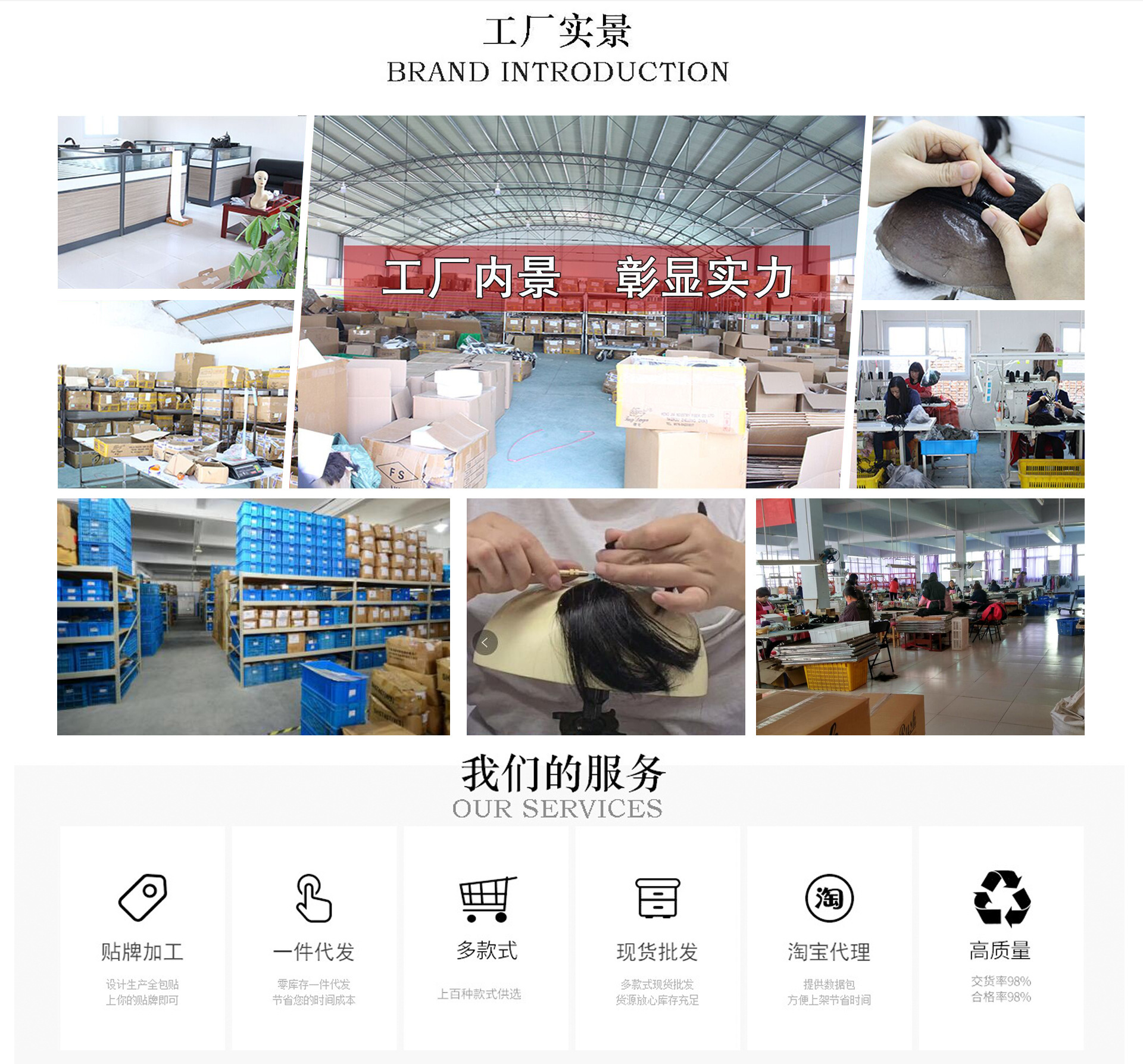 中高档高温丝假发,假发圈,马尾,接发片,刘海,发包,头带,发箍,发网等。