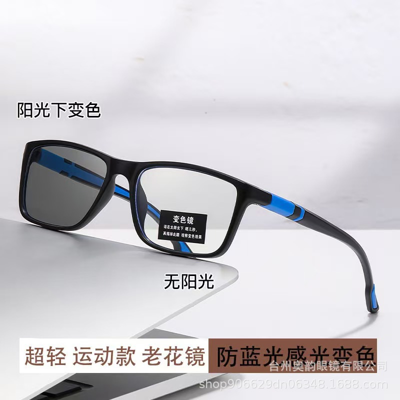 中高年向けの新しいファッショナブルで快適なシリコン製スポーツ老眼鏡、高精細、抗ブルーライト、スクエアフレーム、色が変わる老眼鏡、卸売