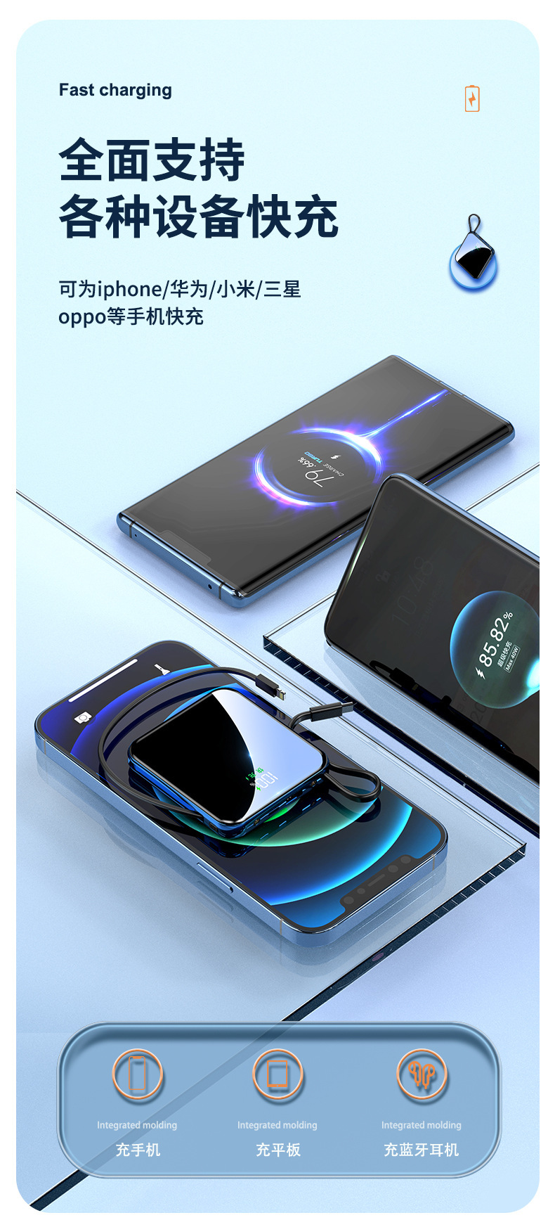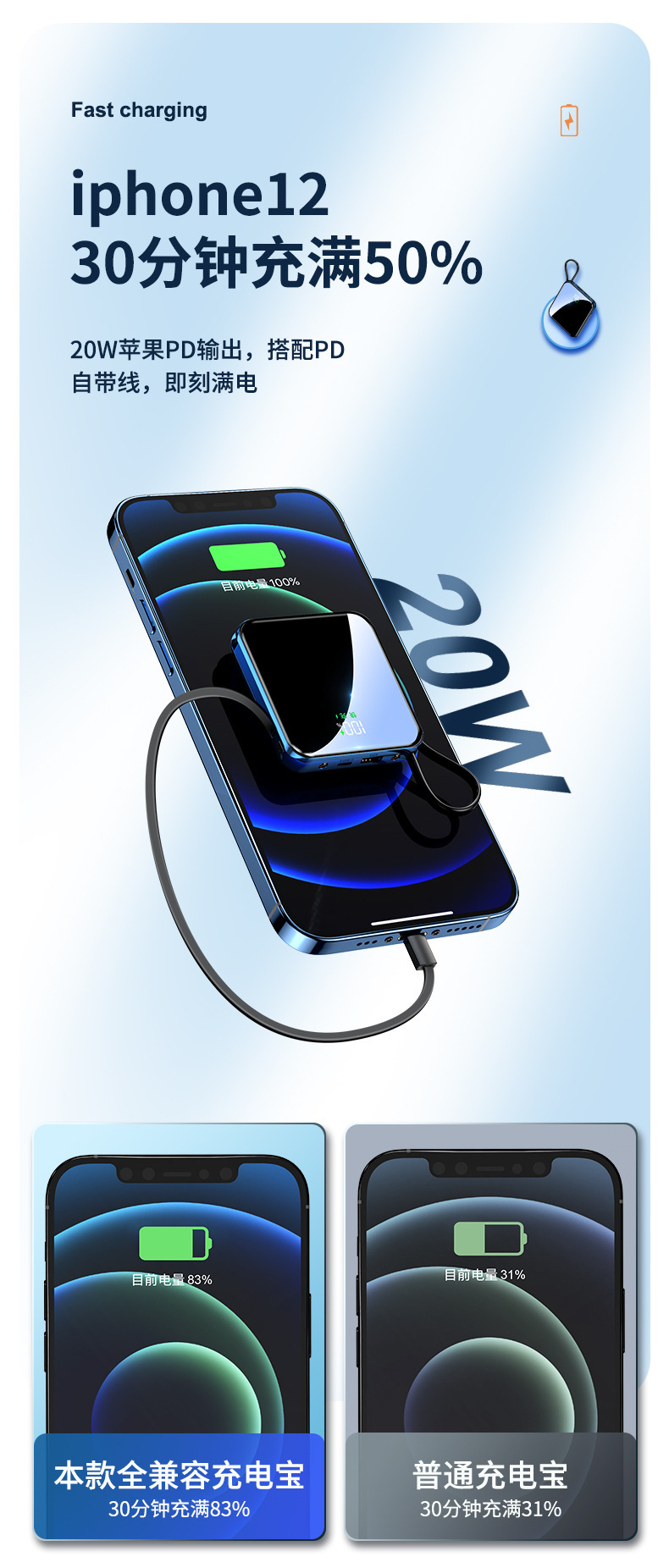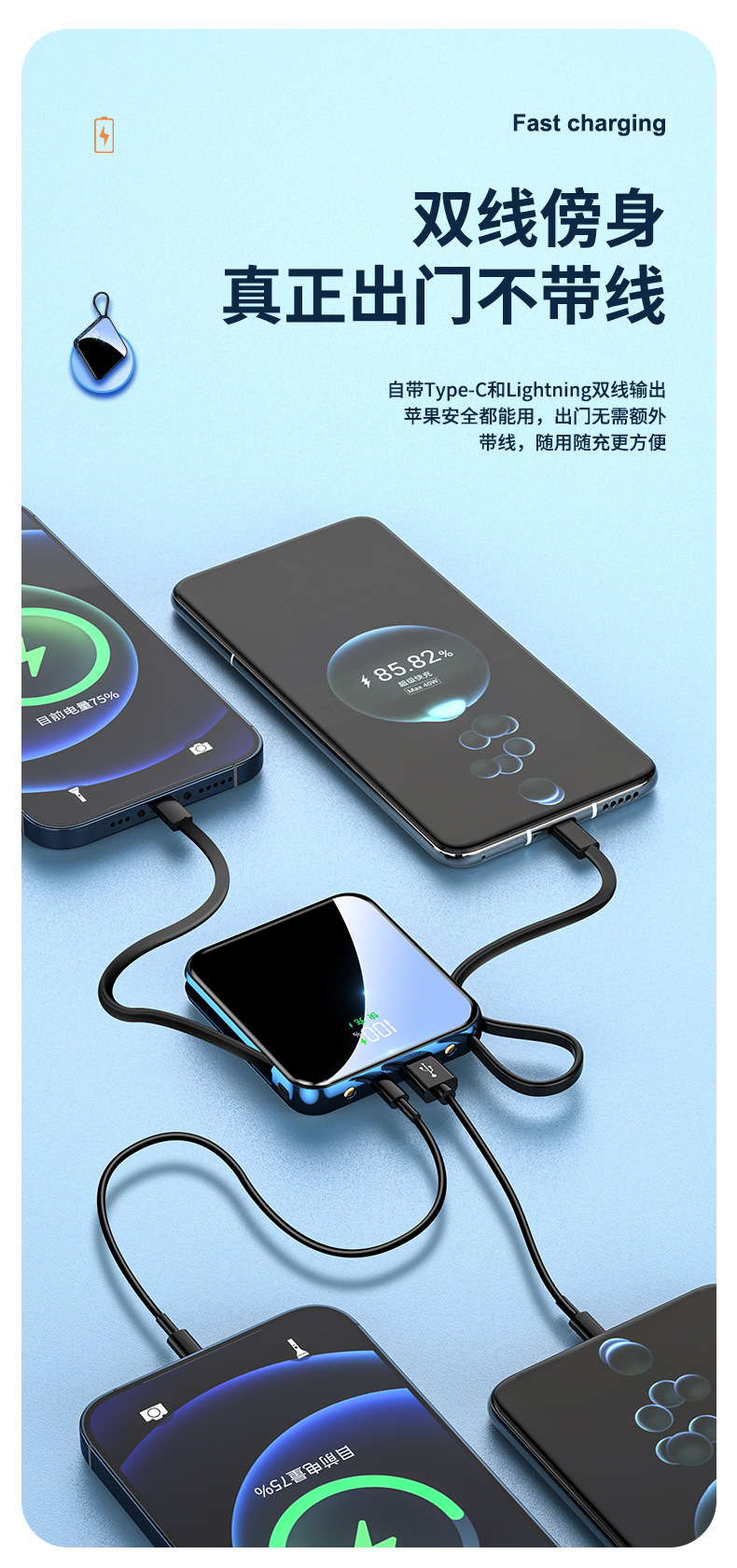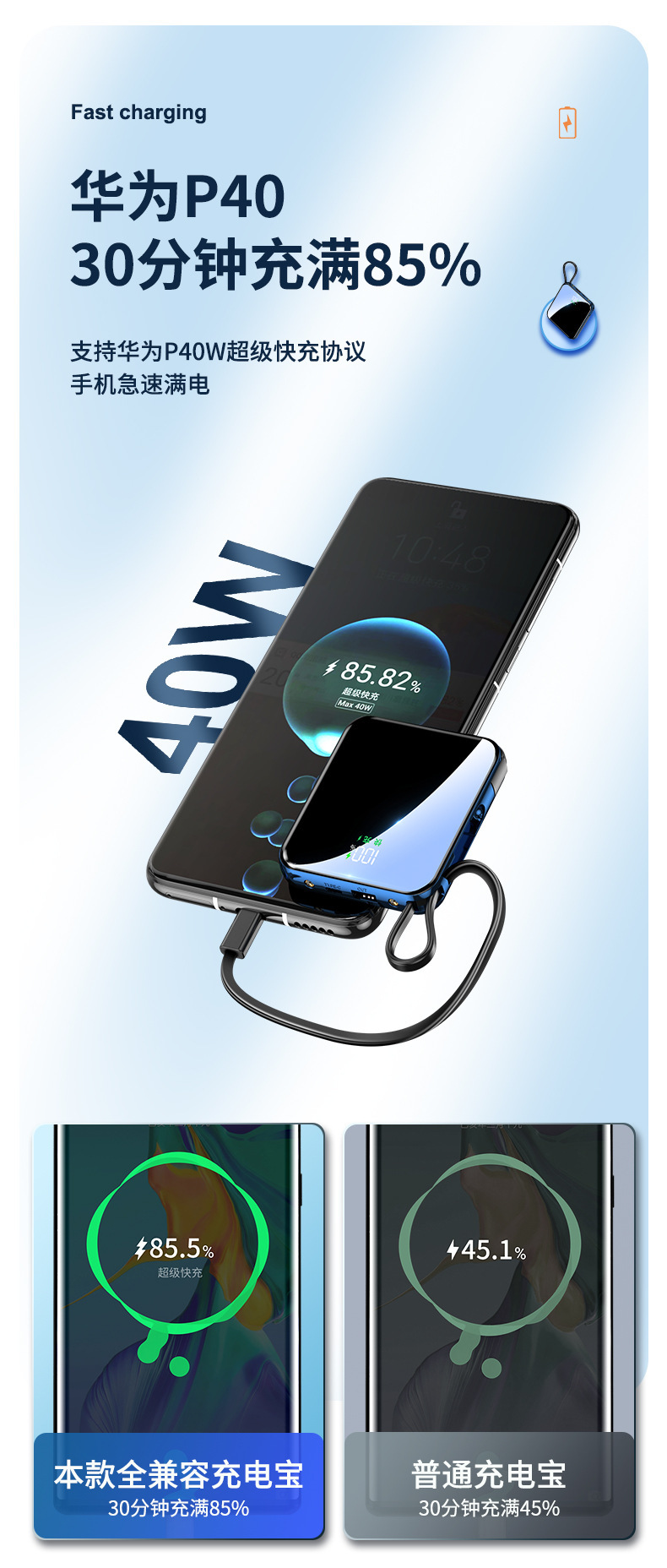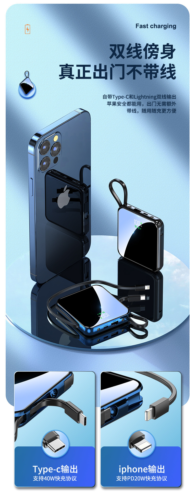 跨境礼品3C认证自带线22.5W超级快充电宝快充轻薄便携移动电源定