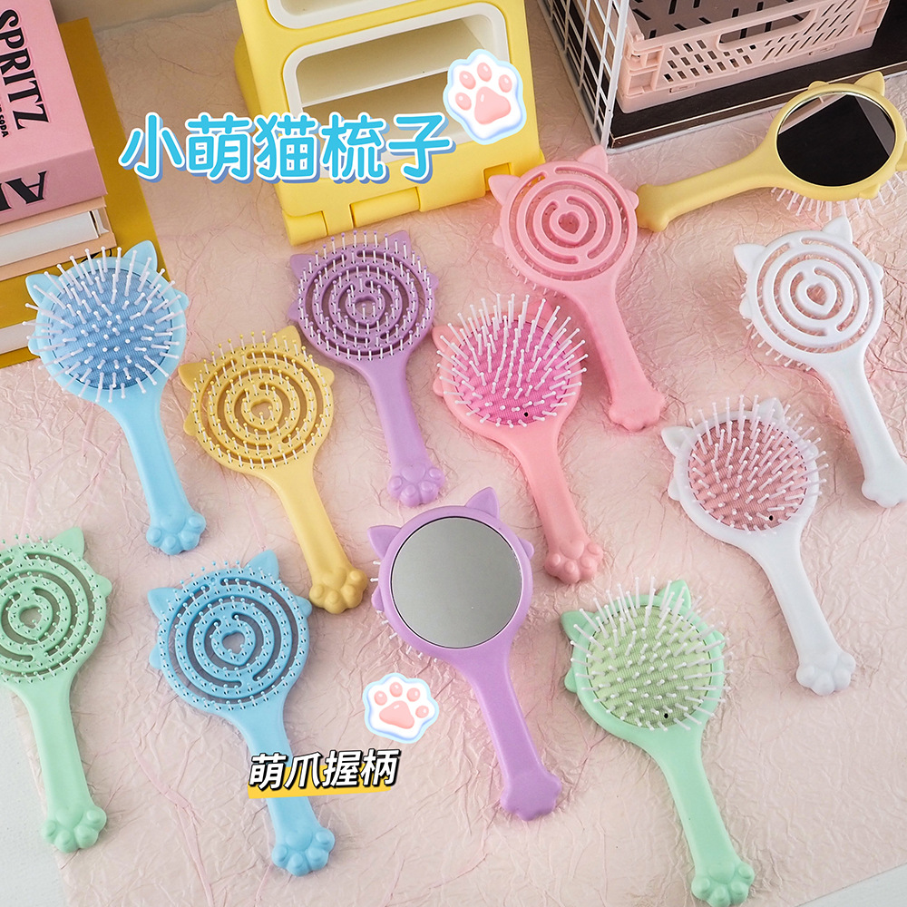 かわいい小さな猫のエアバッグコーム、ミラー付き、手持ち式2in1エアバッグコーム、キャンディーカラー、携帯用、中空マッサージコーム