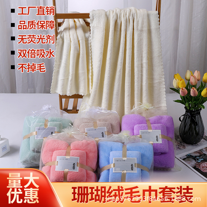 越境販売用トリコットコーラルベルベットタオル3点セット 吸水性抜群、毛抜けなし、通気性、厚手タオル、バスタオル、カスタム卸売