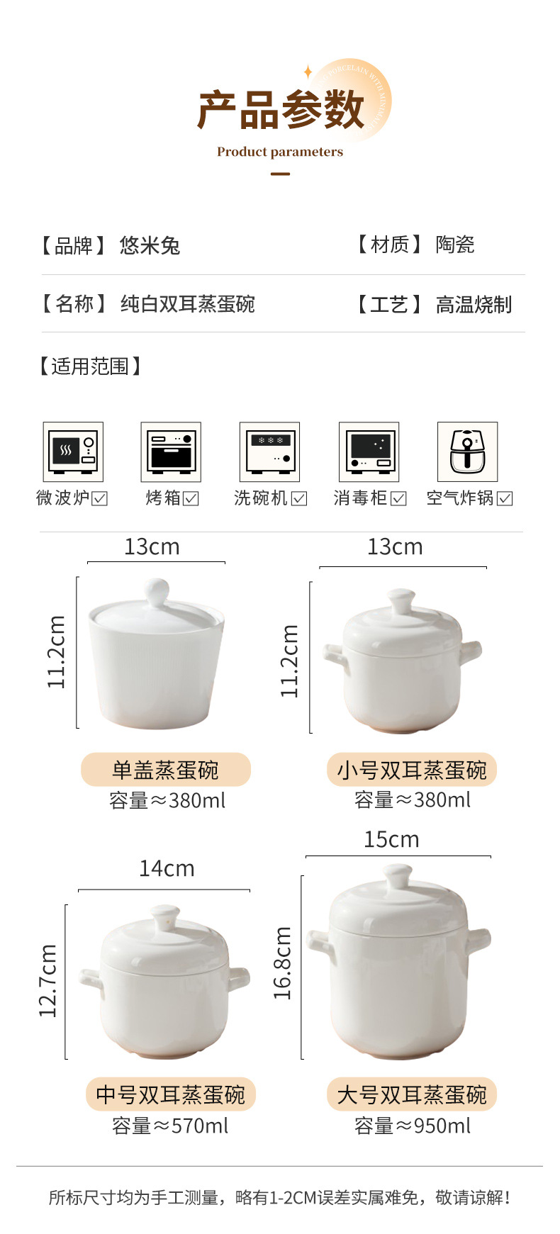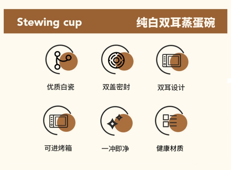 颜色 双耳小号炖盅(360ml),双耳蒸蛋碗中号(550ml可蒸3-4个鸡蛋),双耳蒸蛋碗中号带勺(可蒸3-4个鸡蛋),双耳蒸蛋碗大号(900ml可蒸7-9个鸡蛋),双耳蒸蛋碗大号带勺(可蒸7-9个鸡蛋),5英寸蒸蛋碗(480ml带瓷盖),3.5英寸炖盅(250ml),4.5英寸炖盅(500ml),4英寸炖盅(300ml),双线款4寸炖盅(350ml),6英寸蒸蛋碗(1000ml带瓷盖),4英寸蒸蛋碗(300ml带瓷盖),福字系列炖盅白-大,福字系列炖盅白-小,福字系列炖盅黑-大,福字系列炖盅黑-小,红煲食炖盅-白色大号,红煲食炖盅-白色小号,红煲食炖盅-黑色大号,红煲食炖盅-黑色小号,红煲食炖盅-棕色大号,红煲食炖盅-棕色小号
