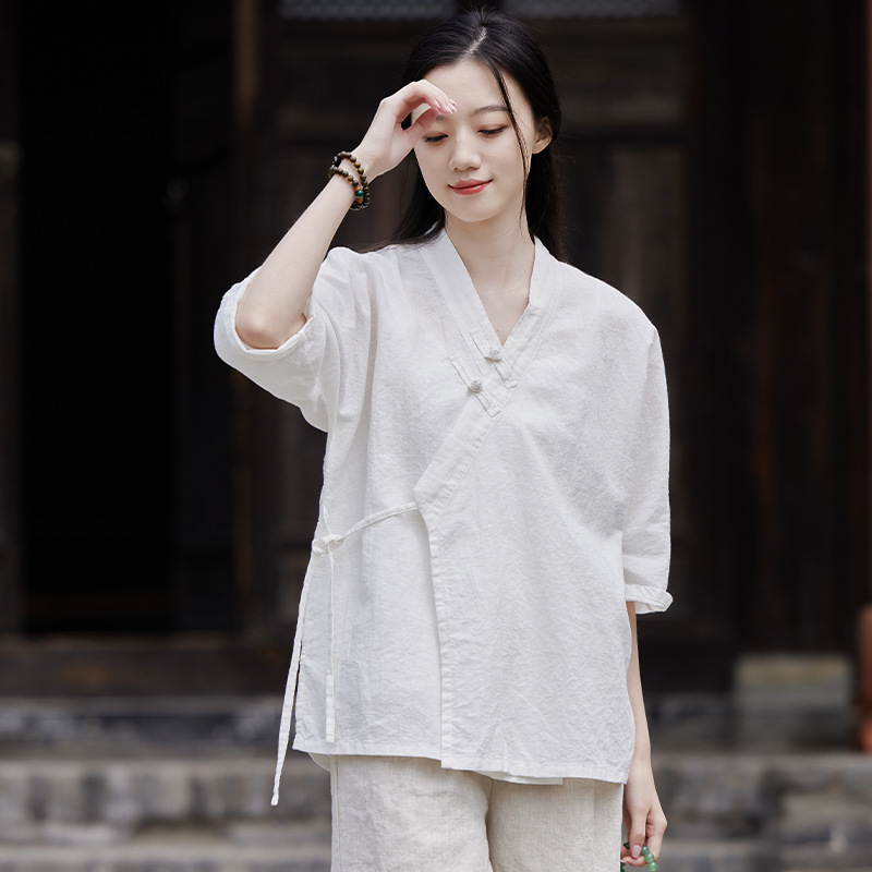 綿とリネンの女性の夏の新しいスタイルの V ネック半袖ボタン付きトップ女性の薄いレースアップ改良された漢服禅茶服