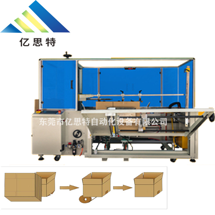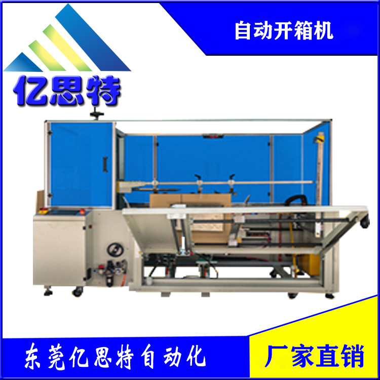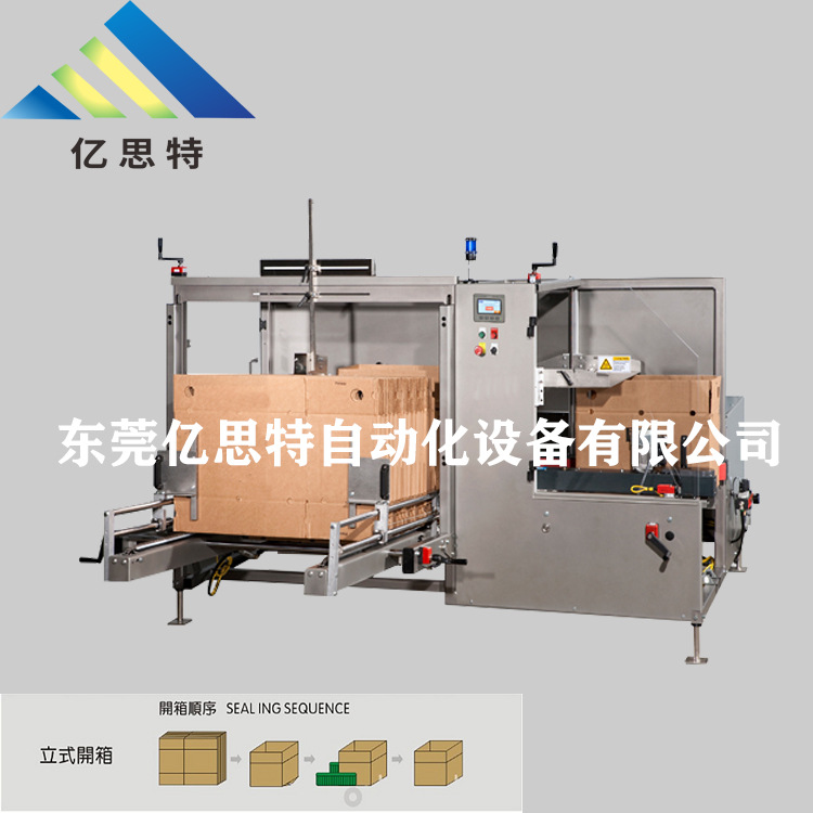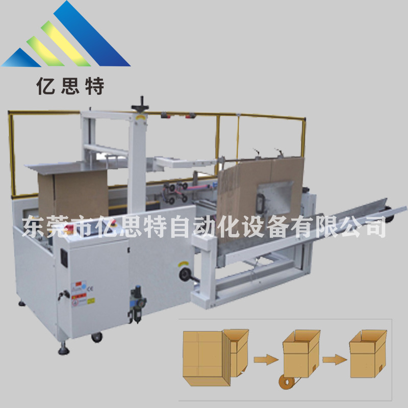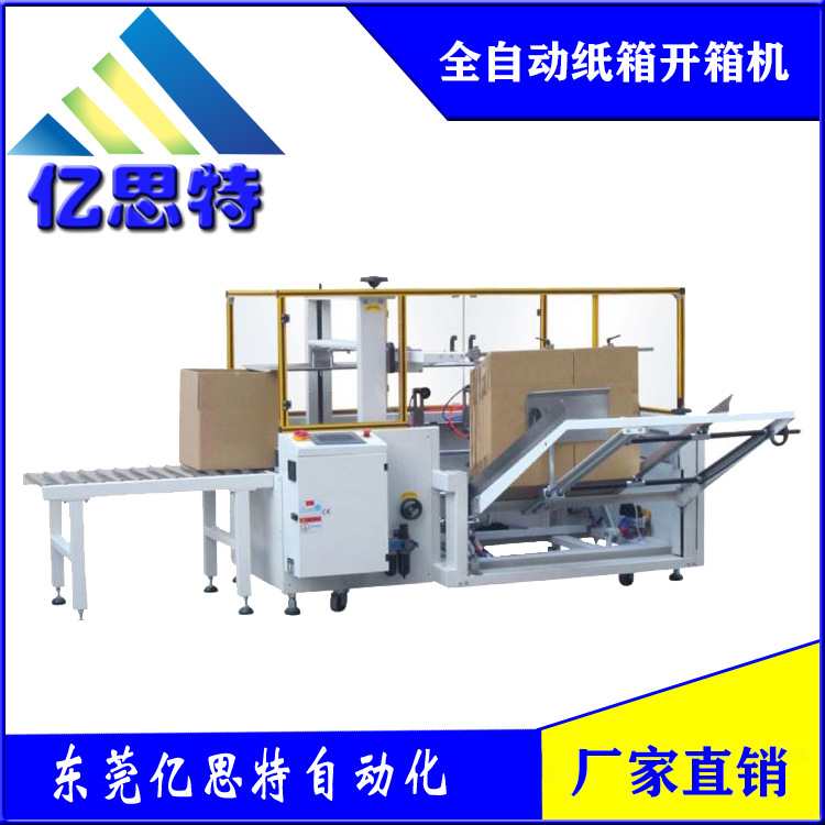 自动开箱机也叫纸箱自动成型封底机,方法是把纸箱板打开,箱子底部按一定程序折合,并用胶带密封后输送给装箱机的专用设备。