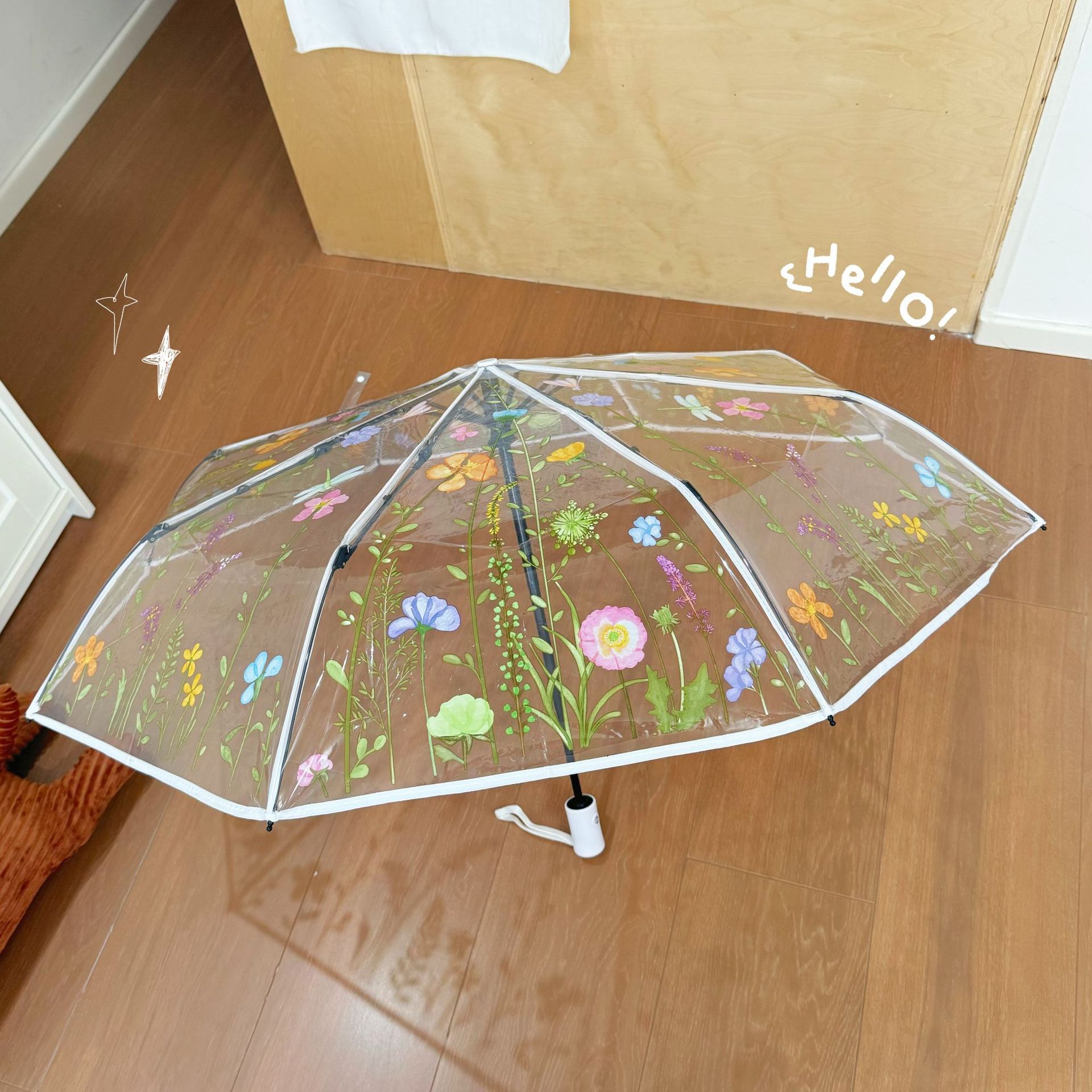 森風の小さな新鮮な花と草の透明傘、厚みのある折りたたみ式手動自動長柄傘、見栄えの良い写真撮影用のアーティファクト