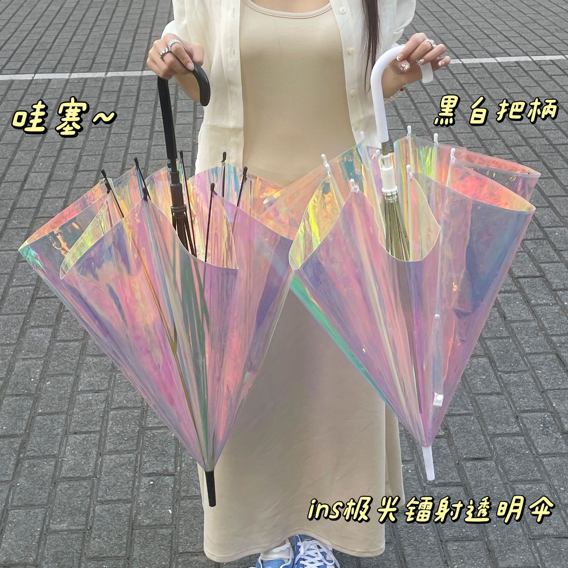 Insディザトーン創意幻彩レーザー透明傘自動晴雨傘ネット赤長柄傘森系虹傘女