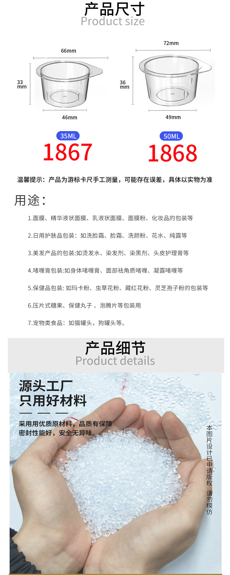 50ml フェイシャルマスクカップ 1868,35ml フェイシャルマスクカップ 1867,35ml ティー缶カップ 1887(透明色のみ),40/ml 四つ葉のクローバーマスクカップ(ベージュのみ),25ml フェイシャルマスクカップ 1869A (黒/白のみ)