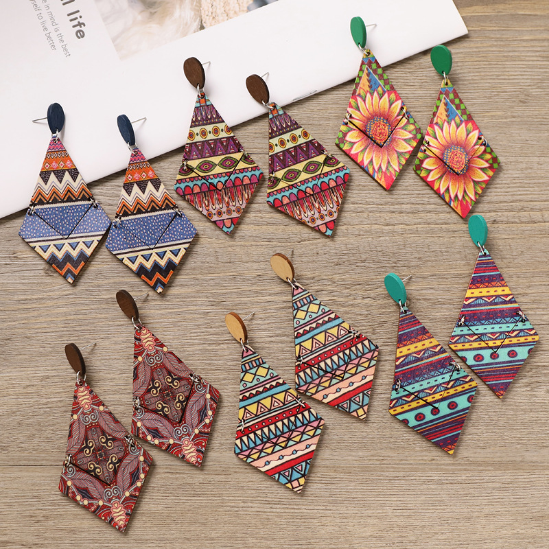 ボヘミアンウッドイヤリング女性のニッチデザイン菱形ロングストライプスプライシングイヤリングエスニックスタイルイヤリング