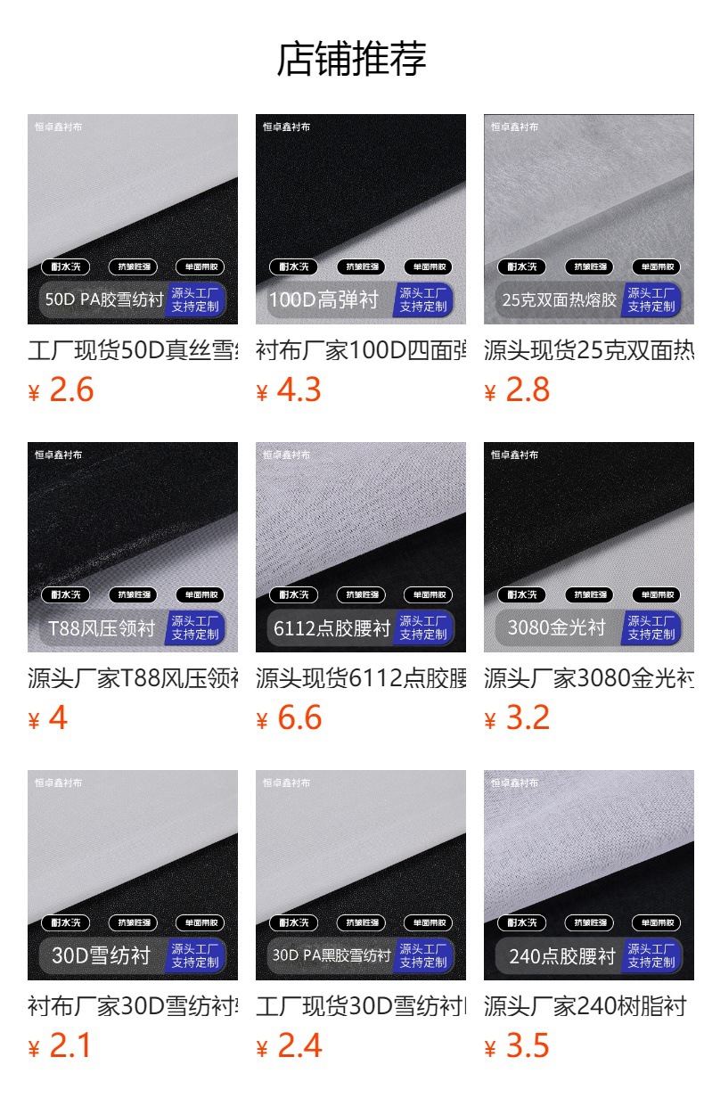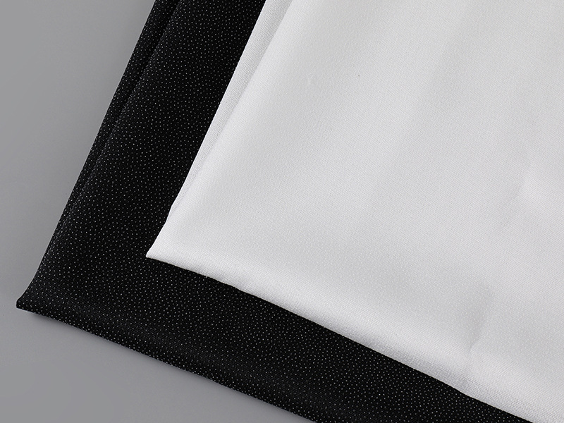颜色有白色黑色黑胶 门幅152CM。有纺粘合衬,胶粒为平胶的白色颗粒,单面带胶,直接用,此款为双点衬。压烫机粘合即可~适合衣服面料门襟,领子,裤腰等处~使用方法:压衬机使用温度:135~145℃C压力:2.0~3.0kg/cm/时间:12s~15s.服装衬布可以起到拉紧定型和支撑的作用,使衣服达到平挺的效果。