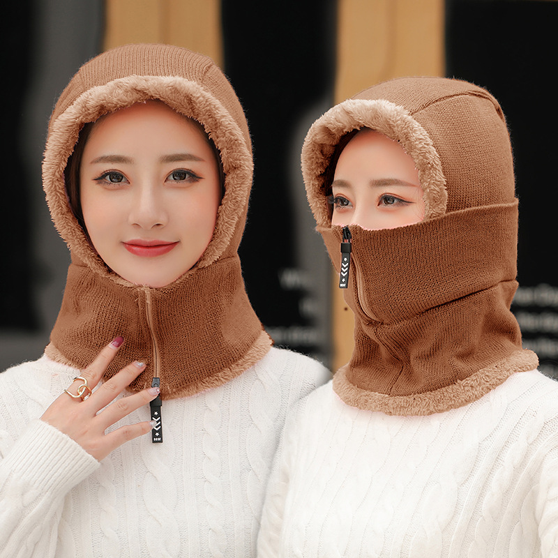 新しい秋と冬の女性のニットウールプルオーバー帽子ジッパースカーフフェイスカバーワンピース屋外プラスベルベット暖かい帽子