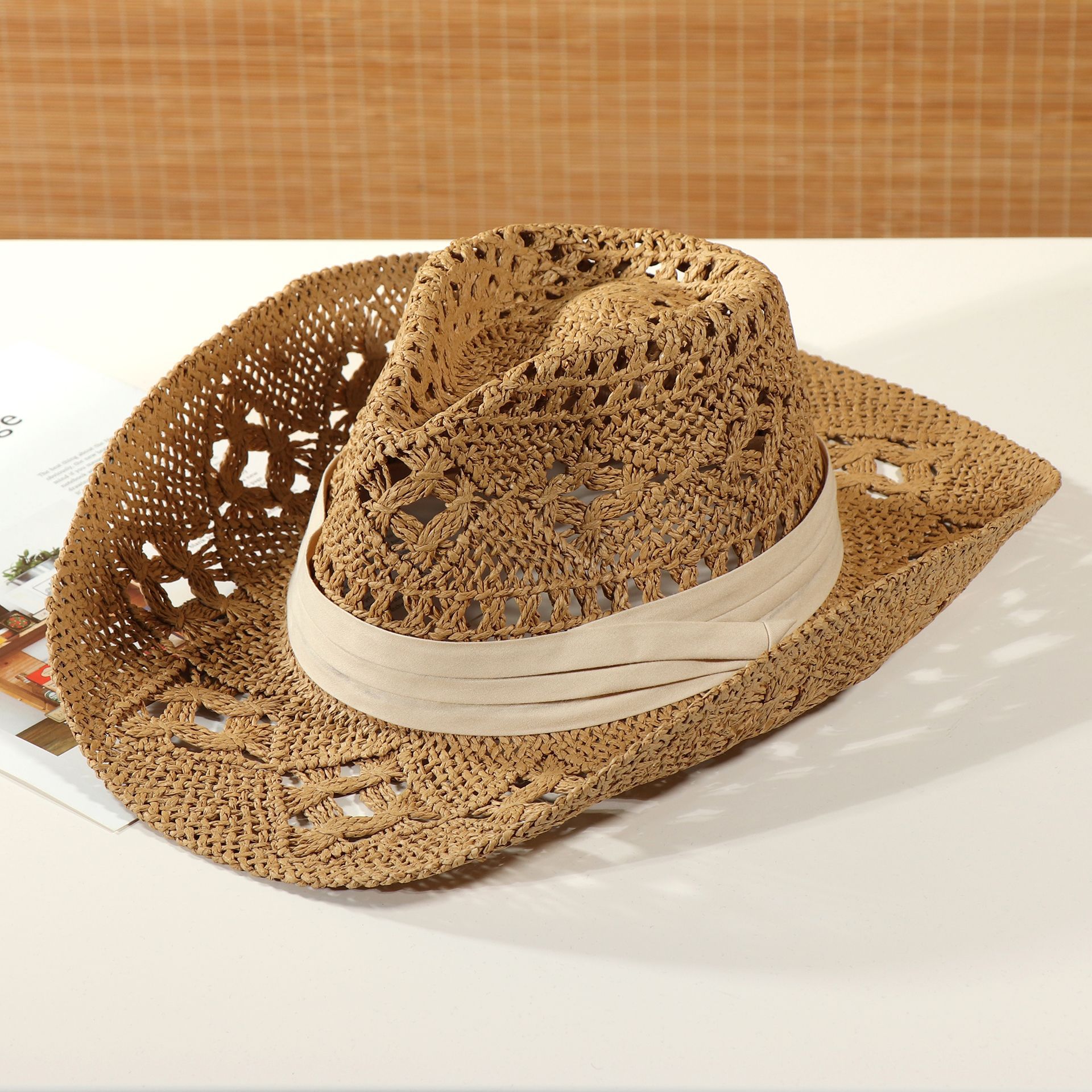 クロスボーダー夏の日焼け止めとサンシェード手作り帽子女性用中空通気性シーサイドビーチ旅行麦わら帽子レトロカウボーイハット