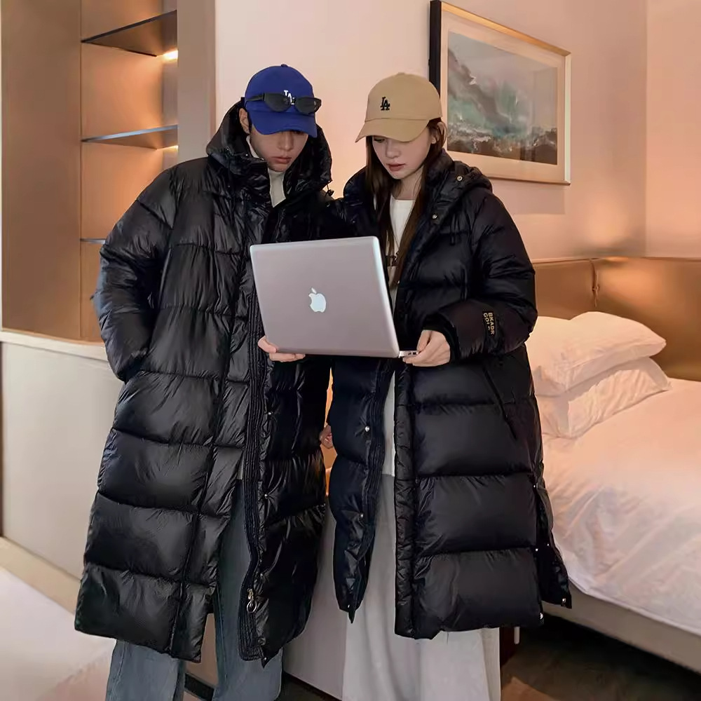 2024冬の新型国境を越えたロングタイプの黒金綿服カップルは膝を厚くして綿服を蓄えた冬のコートの上着が湿っている