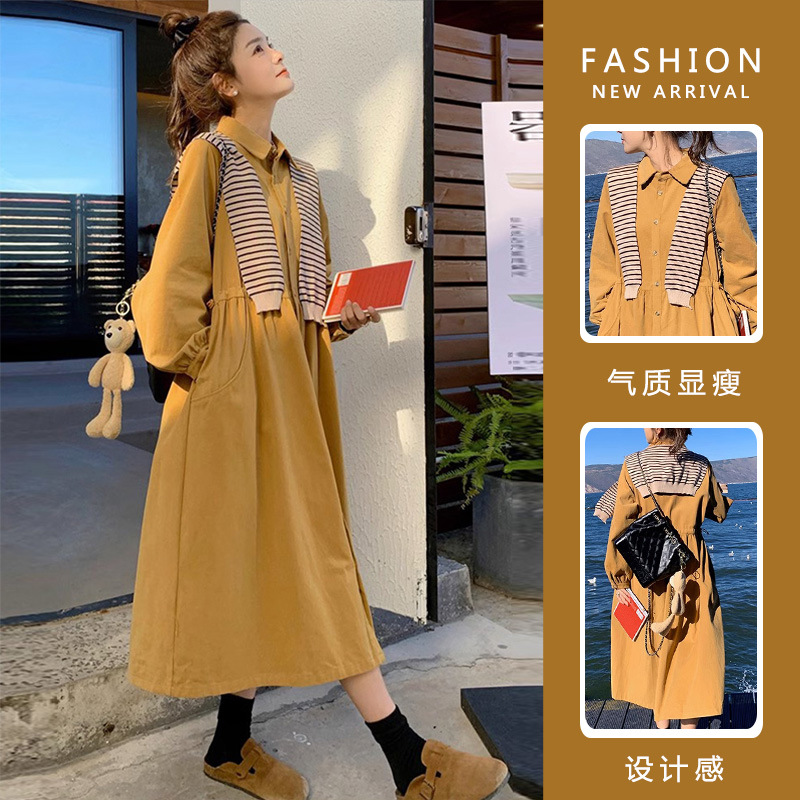 現物妊婦服2024丸首長袖シャツワンピース女性夏初秋痩せa字気質長スカート