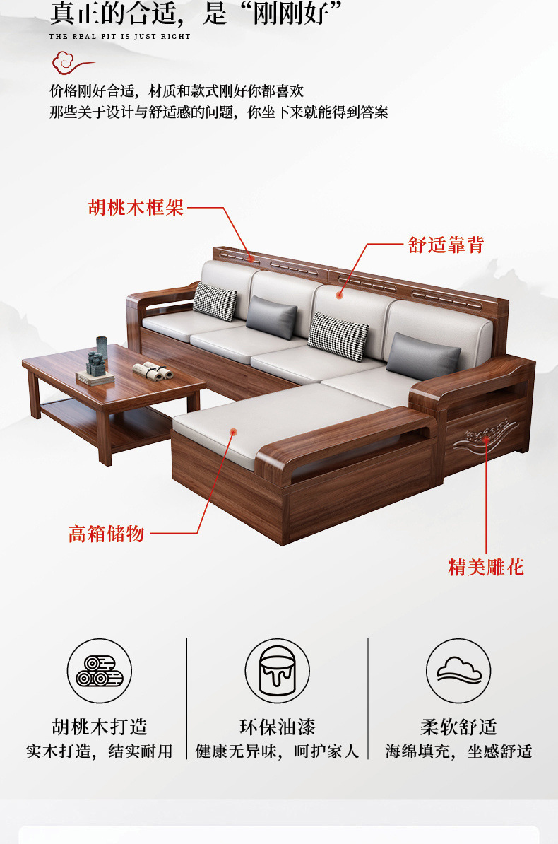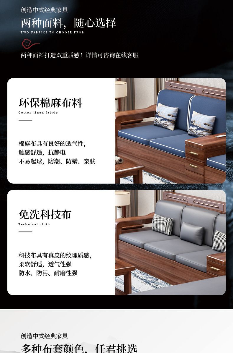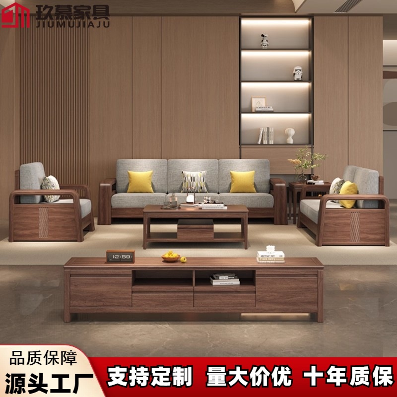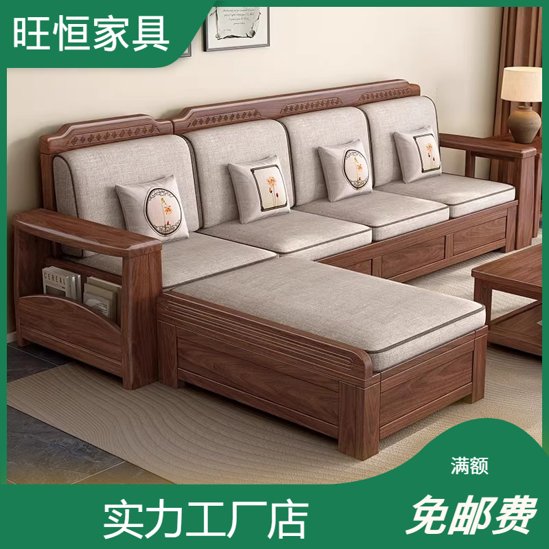 新中国式黒胡桃木実木ソファー客間現代シンプル冬夏両用大小戸型組合せ収納物付き