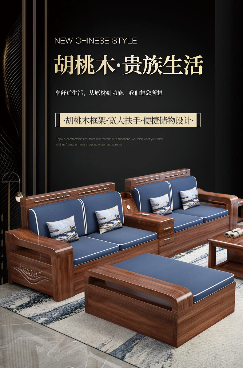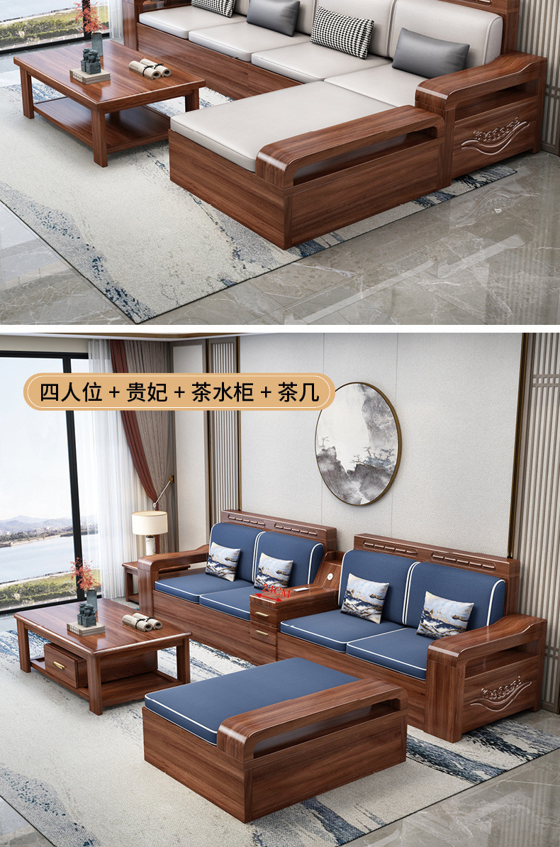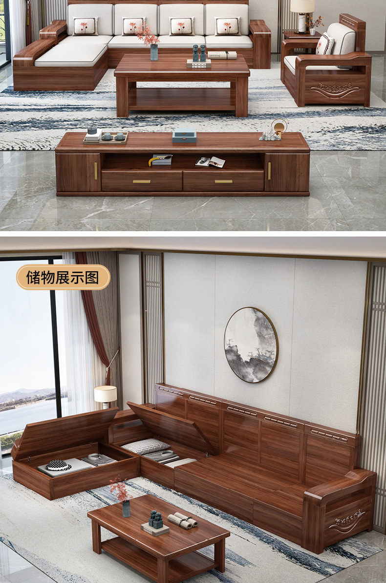 胡桃木実木ソファー高箱貯蔵物セット新中国式ソファーシンプル客間大戸型冬夏両用