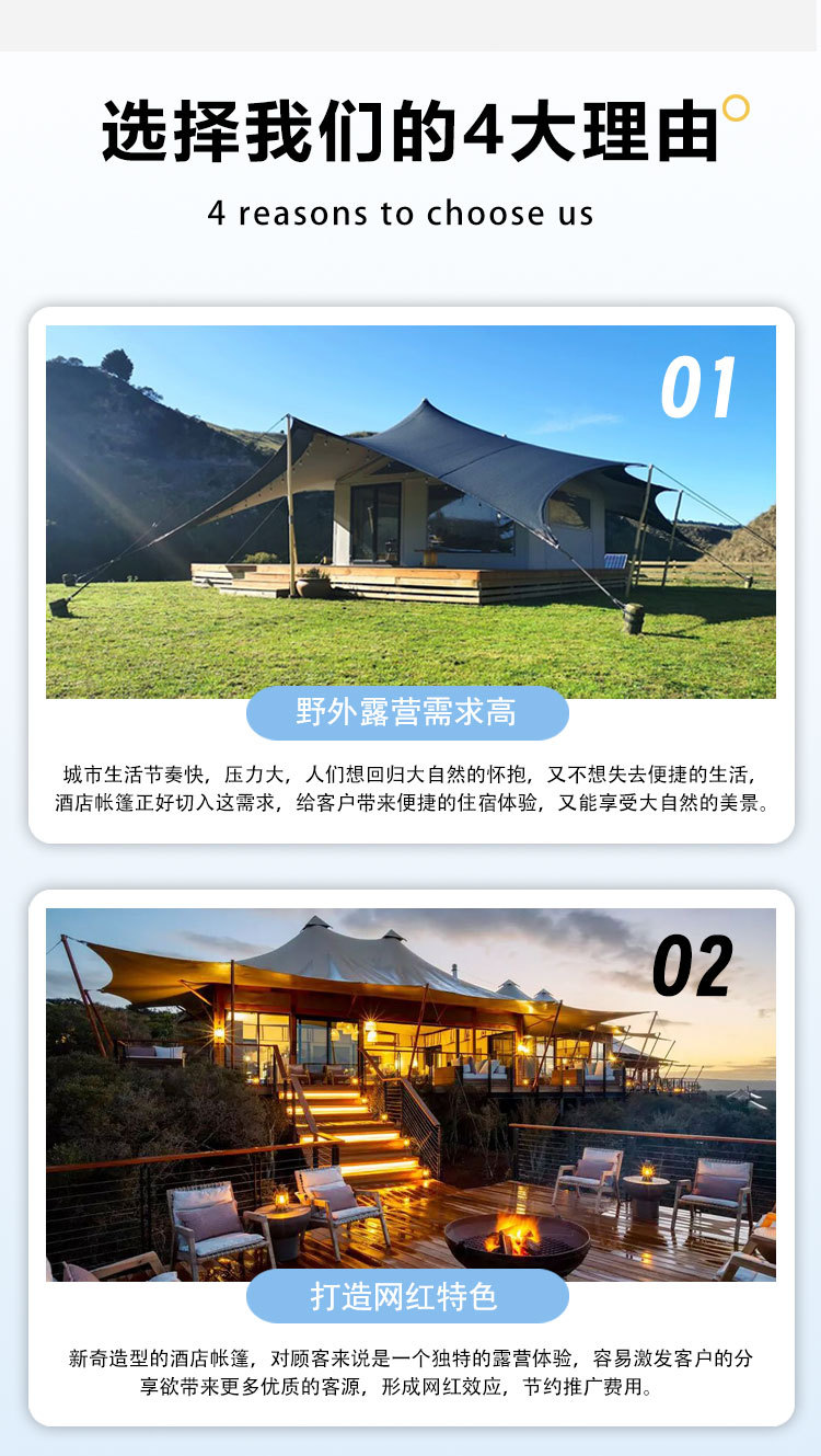 ホテルテント、屋外景勝地、大型高級キャンプ場、高級テント、野外宿泊、民宿、レストラン、ダイニングバー、レストランメーカー
