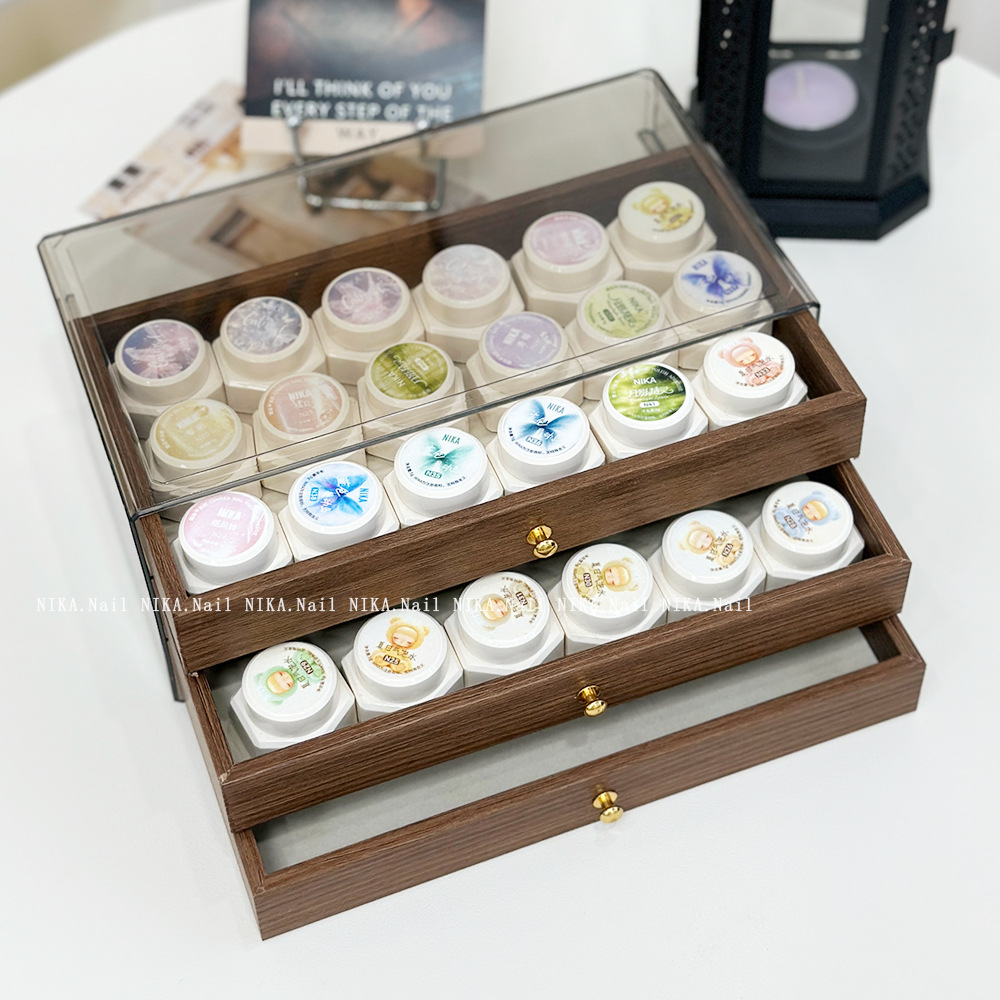 日式罐装胶收纳盒美甲胡桃木抽屉收纳甲油胶拍拍胶罐装收纳