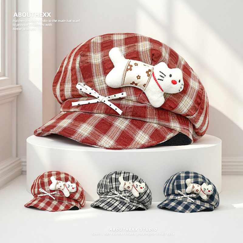 2025新款小猫蝴蝶结格纹八角帽女可爱显脸小贝雷帽甜美百搭帽子潮