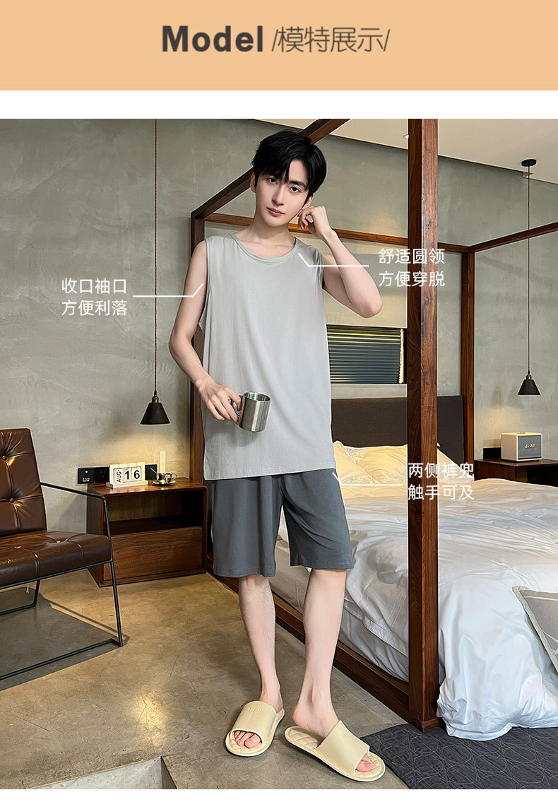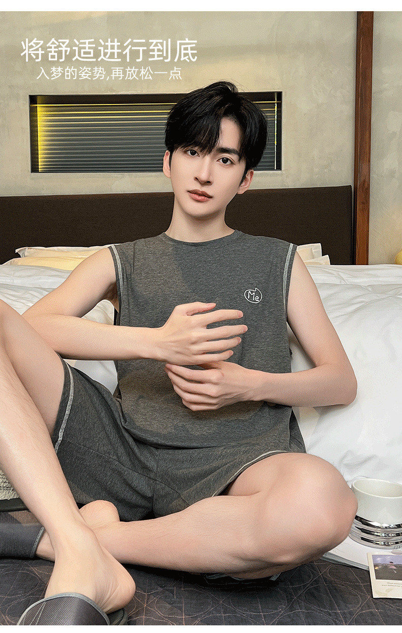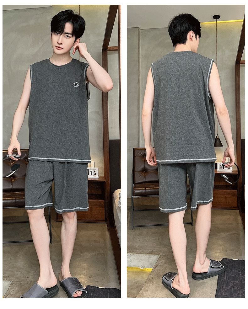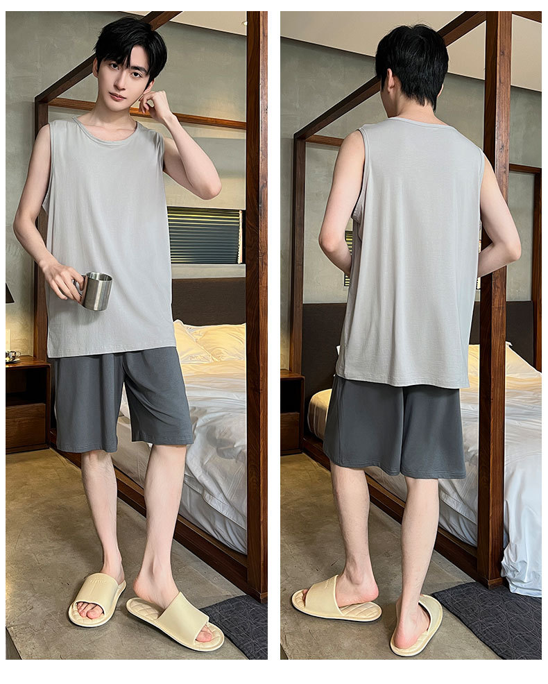 モーダル涼感パジャマ男性夏ノースリーブチョッキパンツ薄いタイプの青少年は家庭服セットを着ることができます。