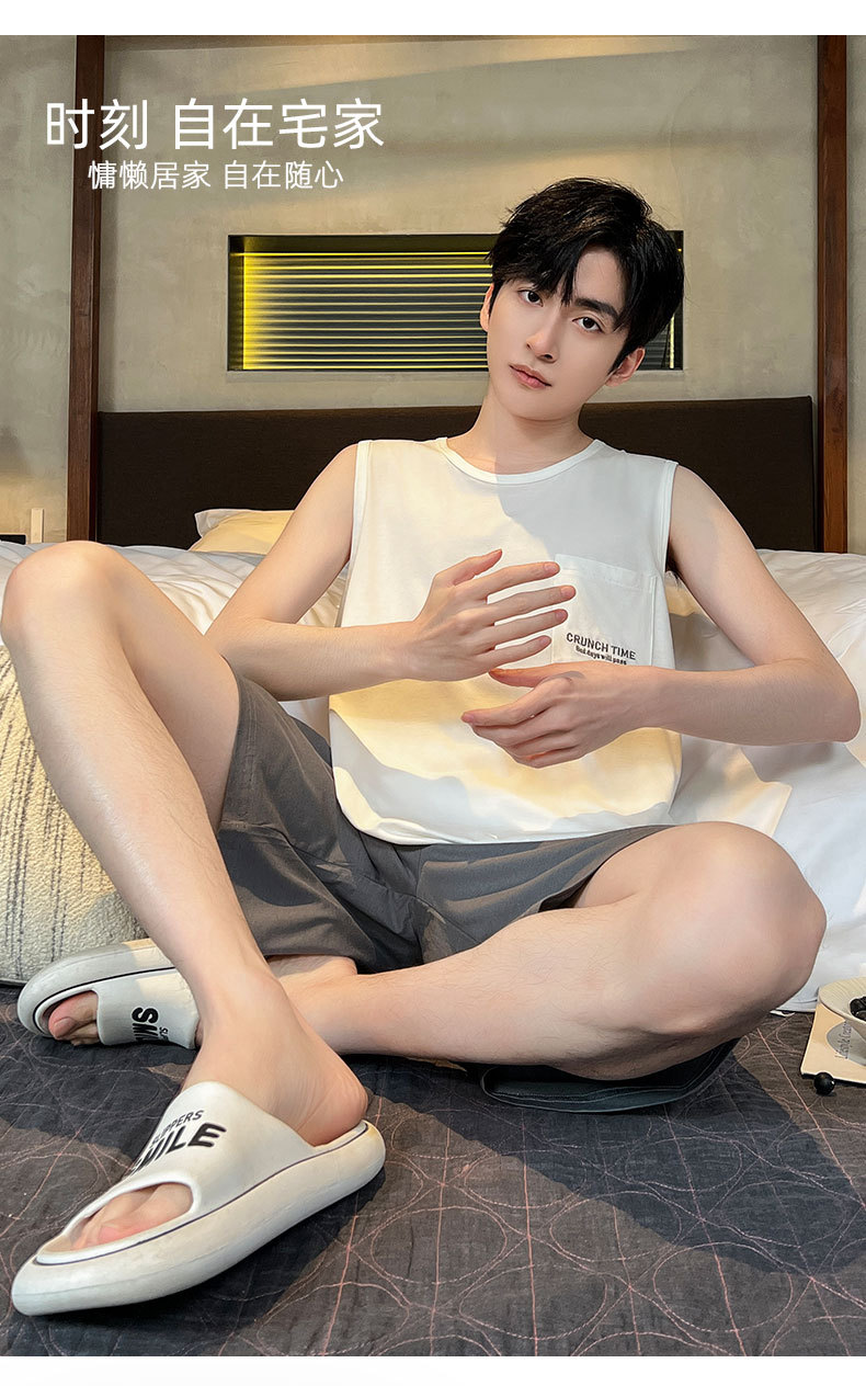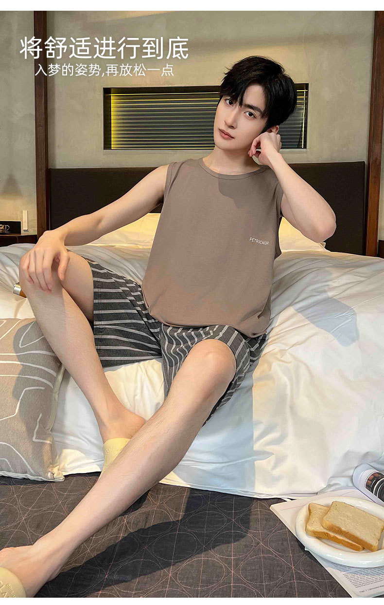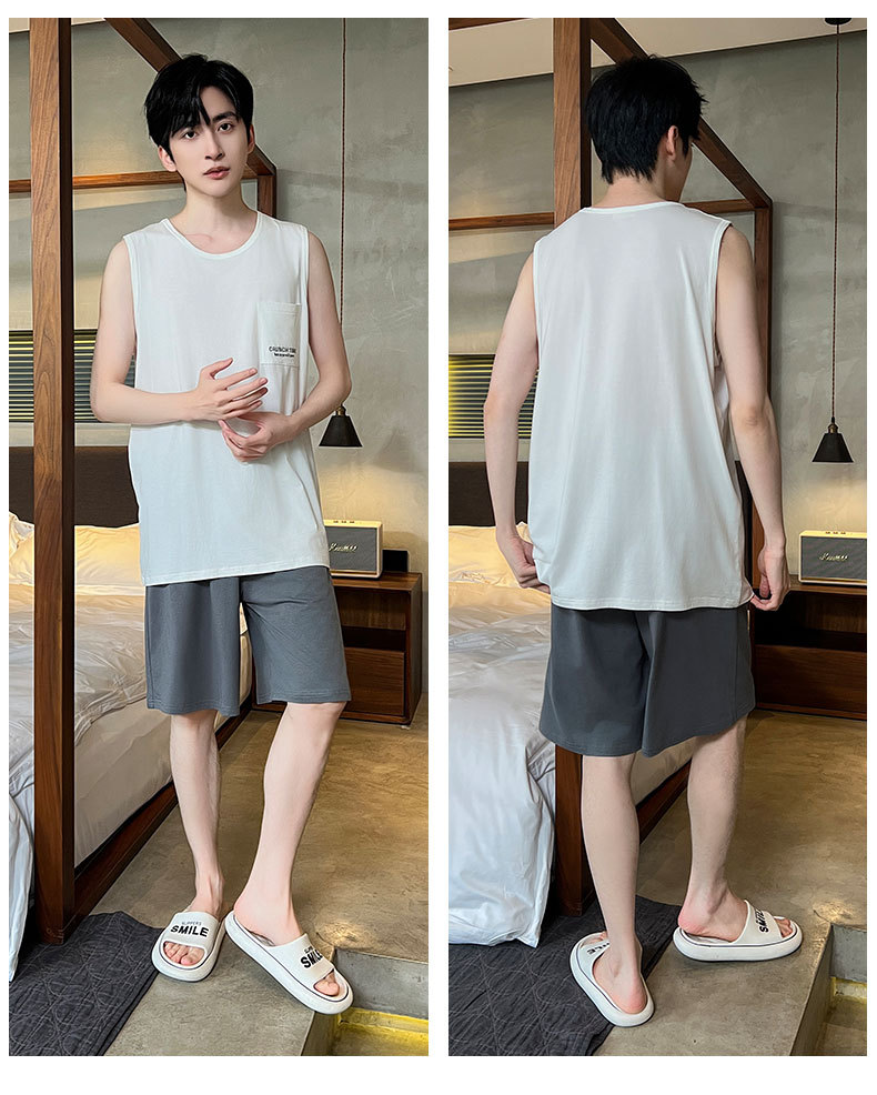 モーダル涼感パジャマ男性夏ノースリーブチョッキパンツ薄いタイプの青少年は家庭服セットを着ることができます。