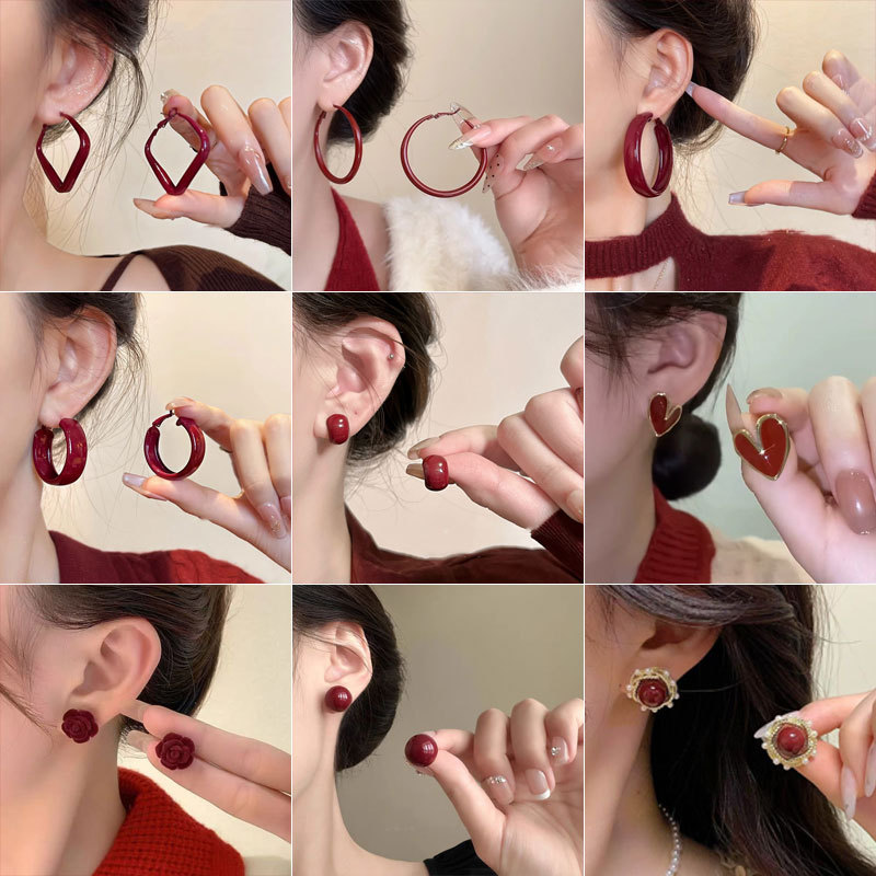 S925シルバーニードル 香港風 新年 レッドイヤリング シンプルフープイヤリング ライトラグジュアリー イヤリング モスキートコイル型イヤリング イヤリングクリップ ノンホール 秋冬