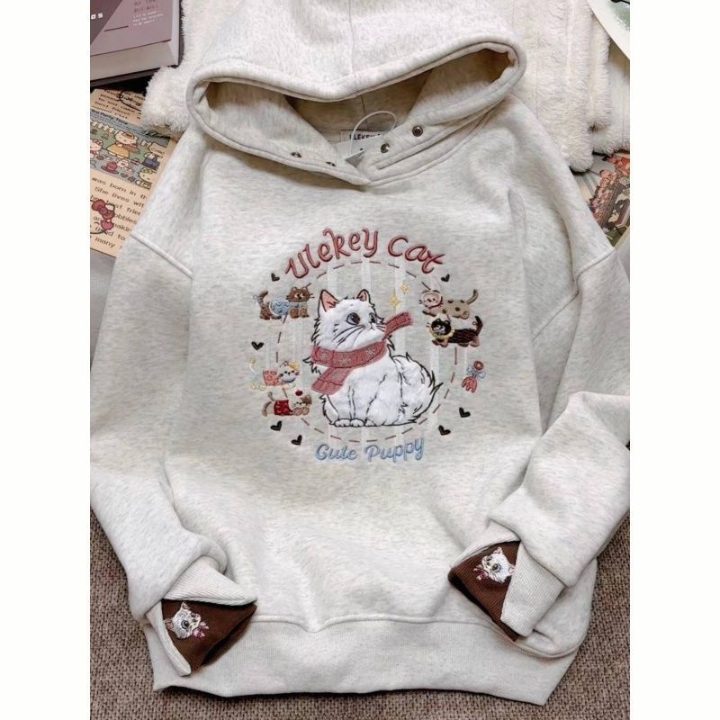 韩系卡通风可爱猫咪植绒刺绣连帽卫衣设计感小众百搭情侣上衣外套