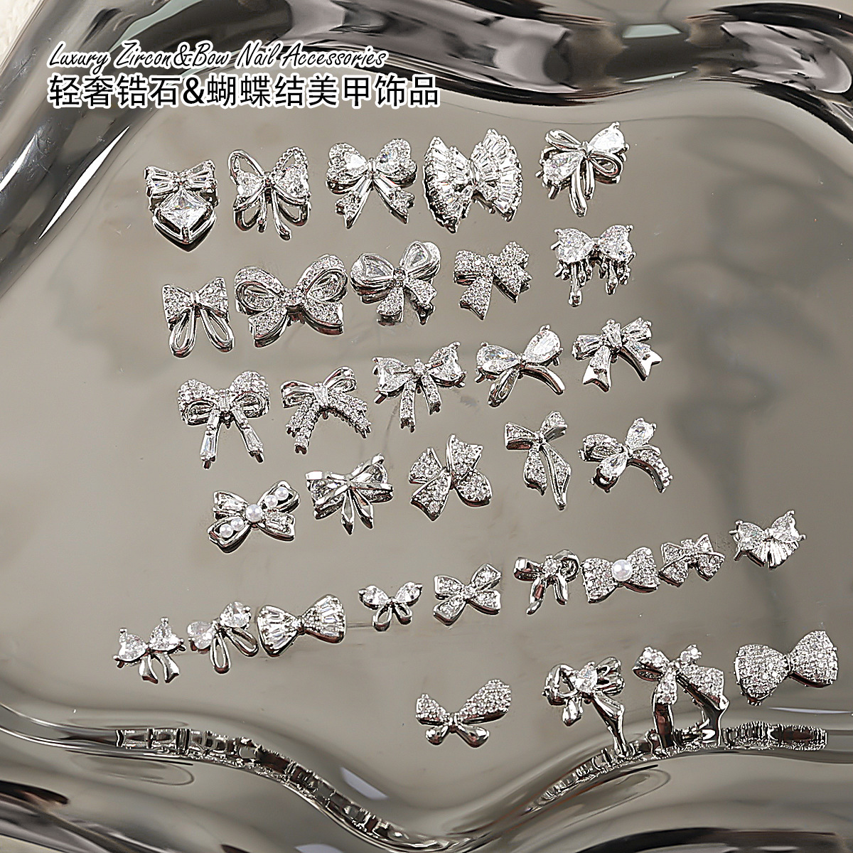 美甲保色银色蝴蝶结蝴蝶美甲锆石高级品质镶钻爆闪指甲装饰品配件
