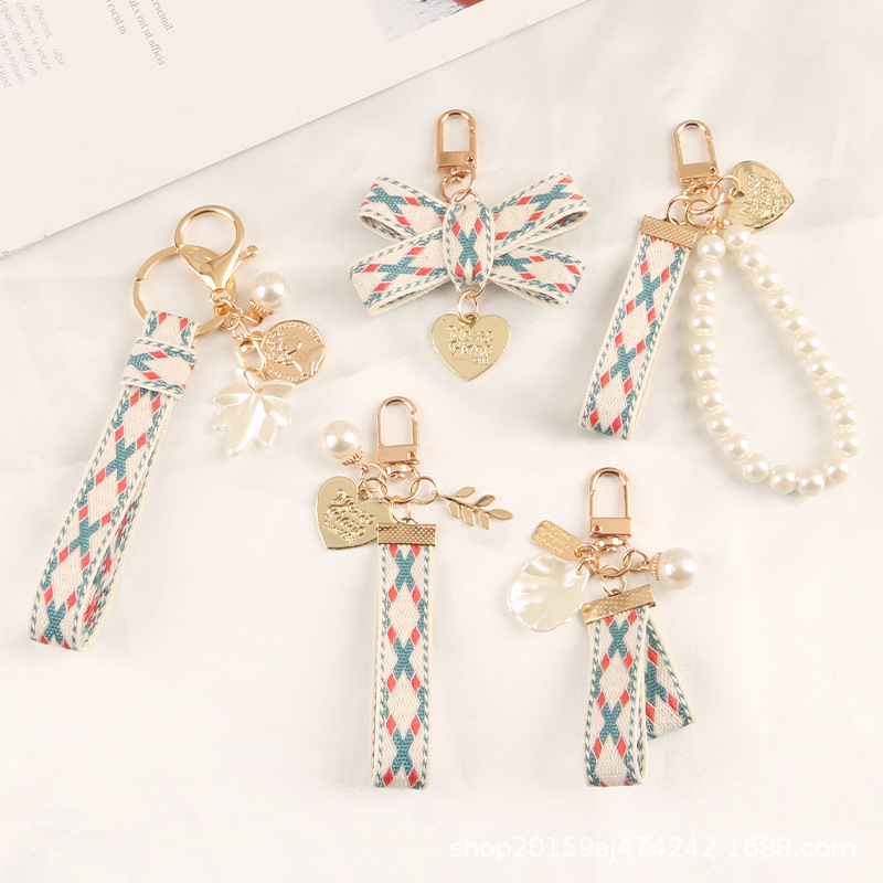 新商品の小さい清新なリボンの自動車の合金のキーホルダーのペンダントのアイデアのストライプの布は真珠の愛の部品を持って飾ります。