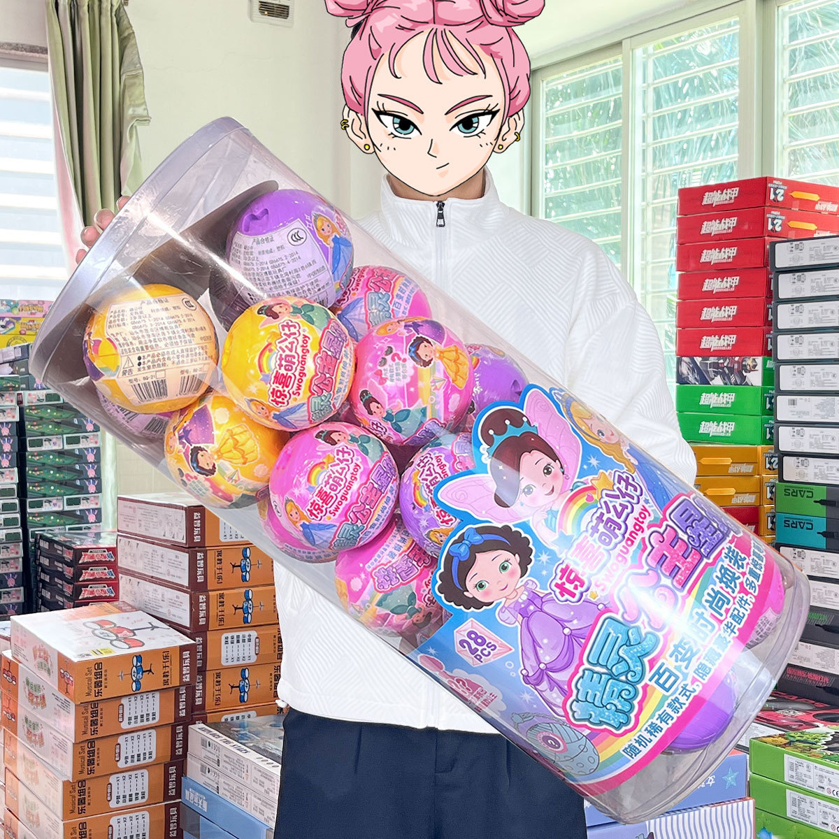 女の子のおもちゃの妖精のお姫様は人形に着替えて、ブラインドボールの子供の賞品を分解します。