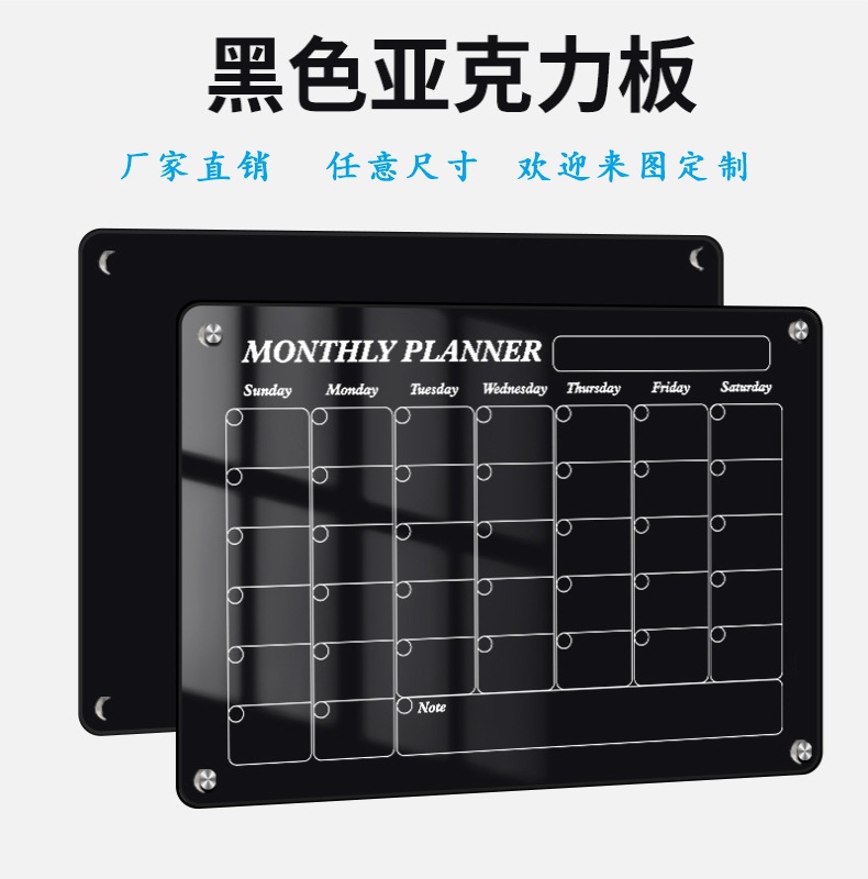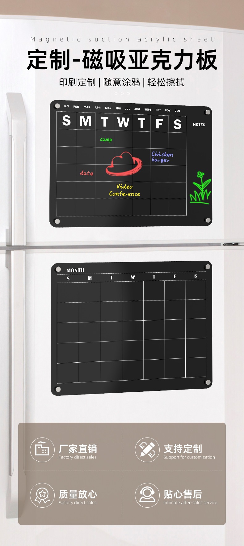 黒色アクリル冷蔵庫は家庭用カレンダー板磁気ドライ拭き板磁気吸引伝言メモ板吊り下げ展示板を貼っている