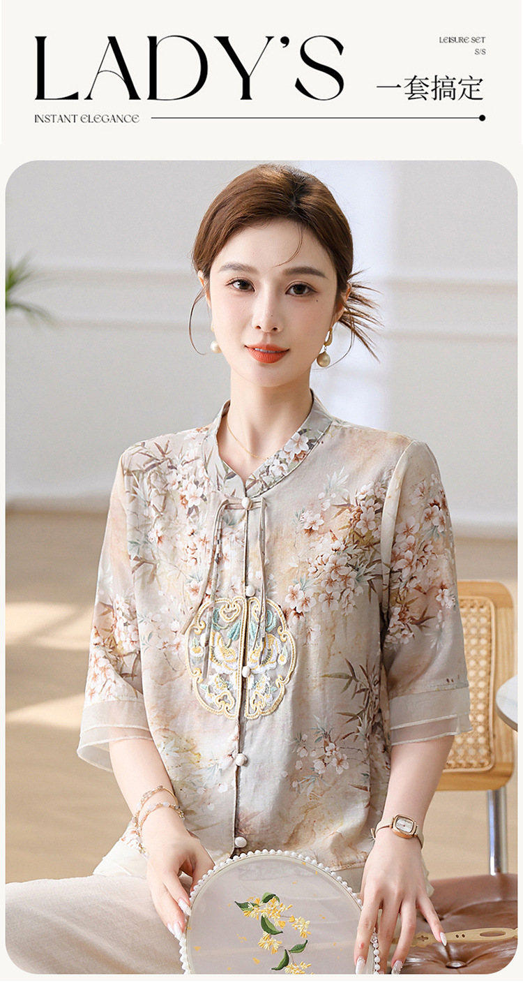 お母さんの中年の夏服の中国式の夏の小さいシャツの洋風のシャツのスーツの新型の中高年の上着の国風の2つのセット
