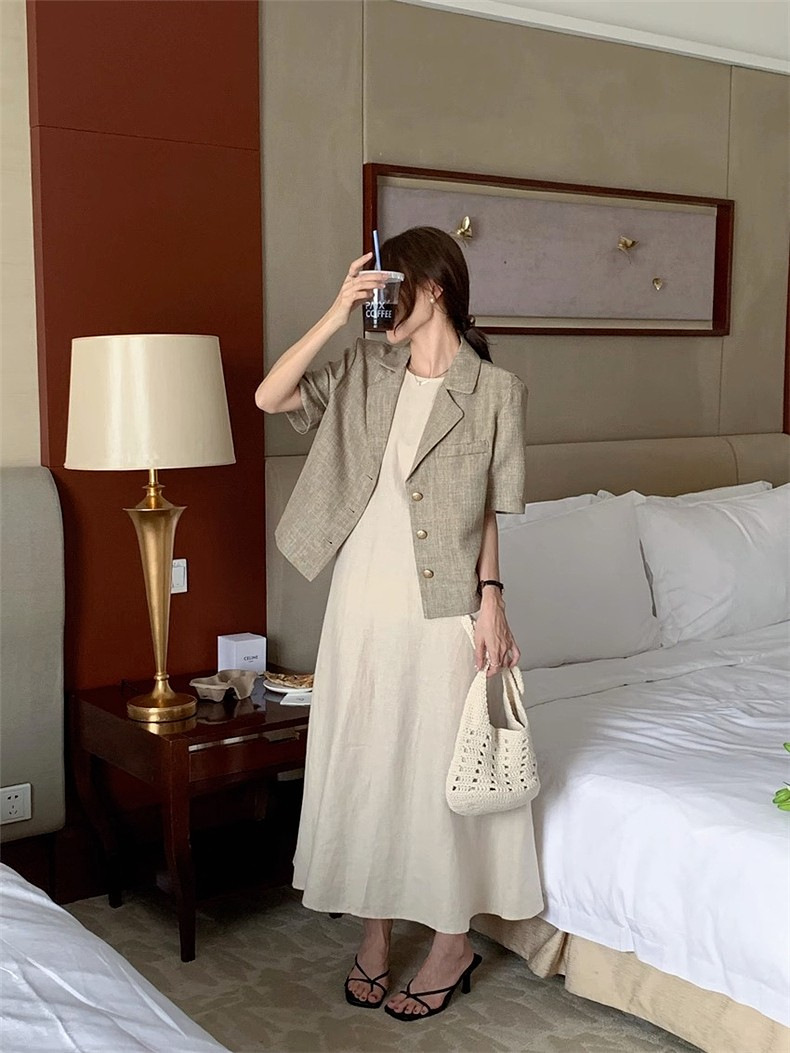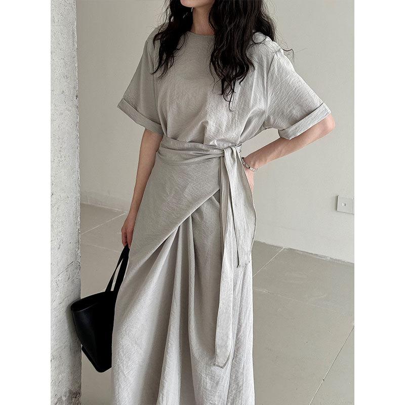 鹿西 ニッチデザイン クロスストラップ半袖ワンピース 春夏新作 ウエストシェイプ 細見え Aラインロングワンピース 3588