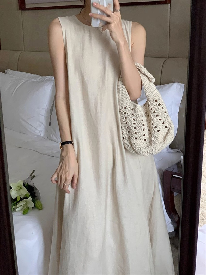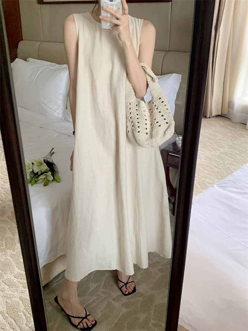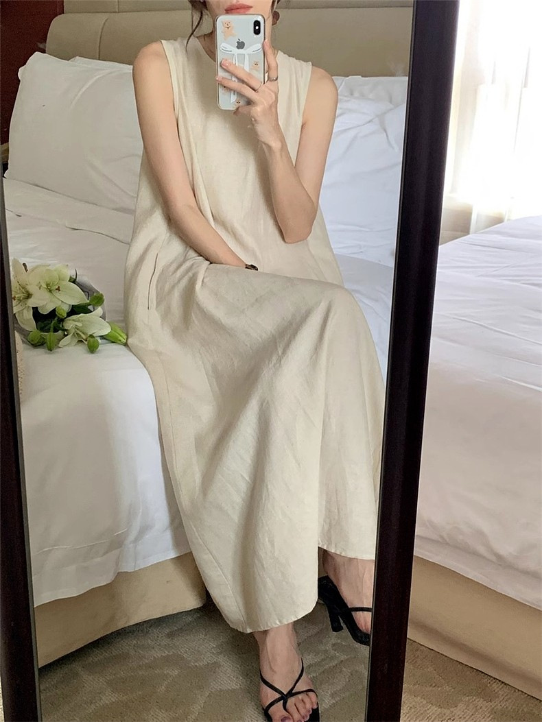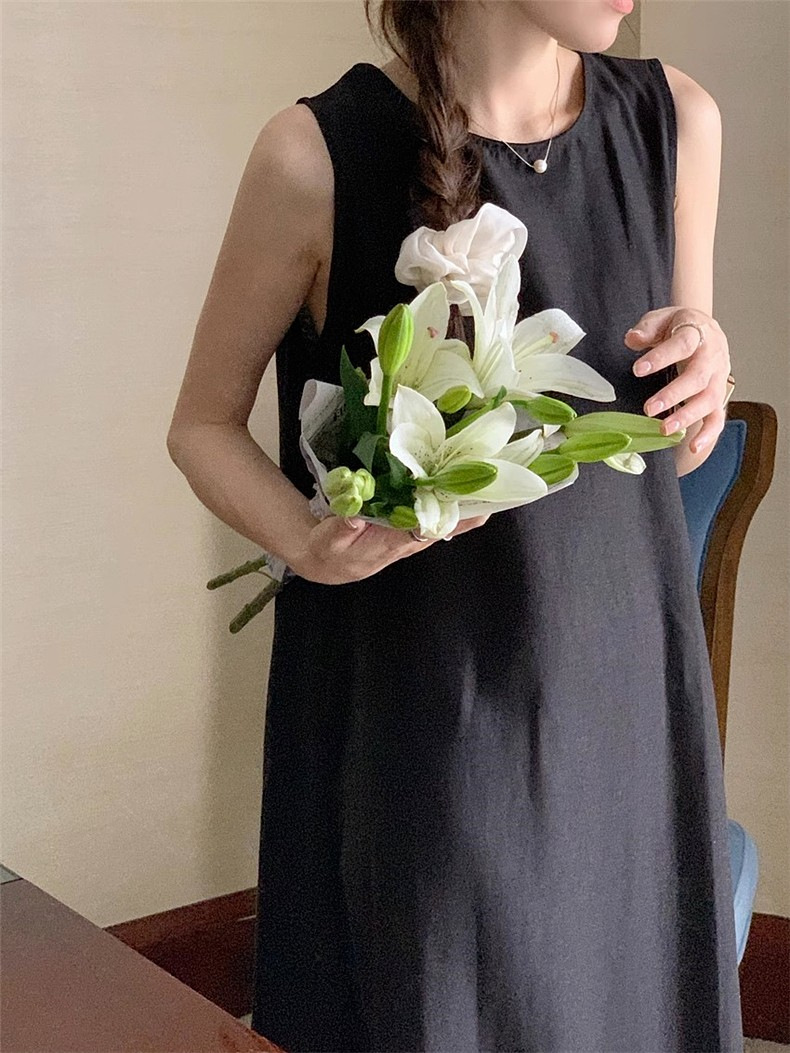 ノースリーブチョッキのワンピースの中の長さの純色はお腹を隠します。