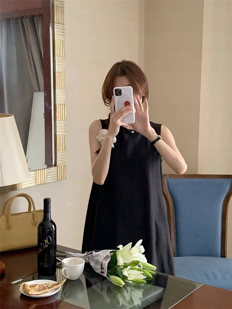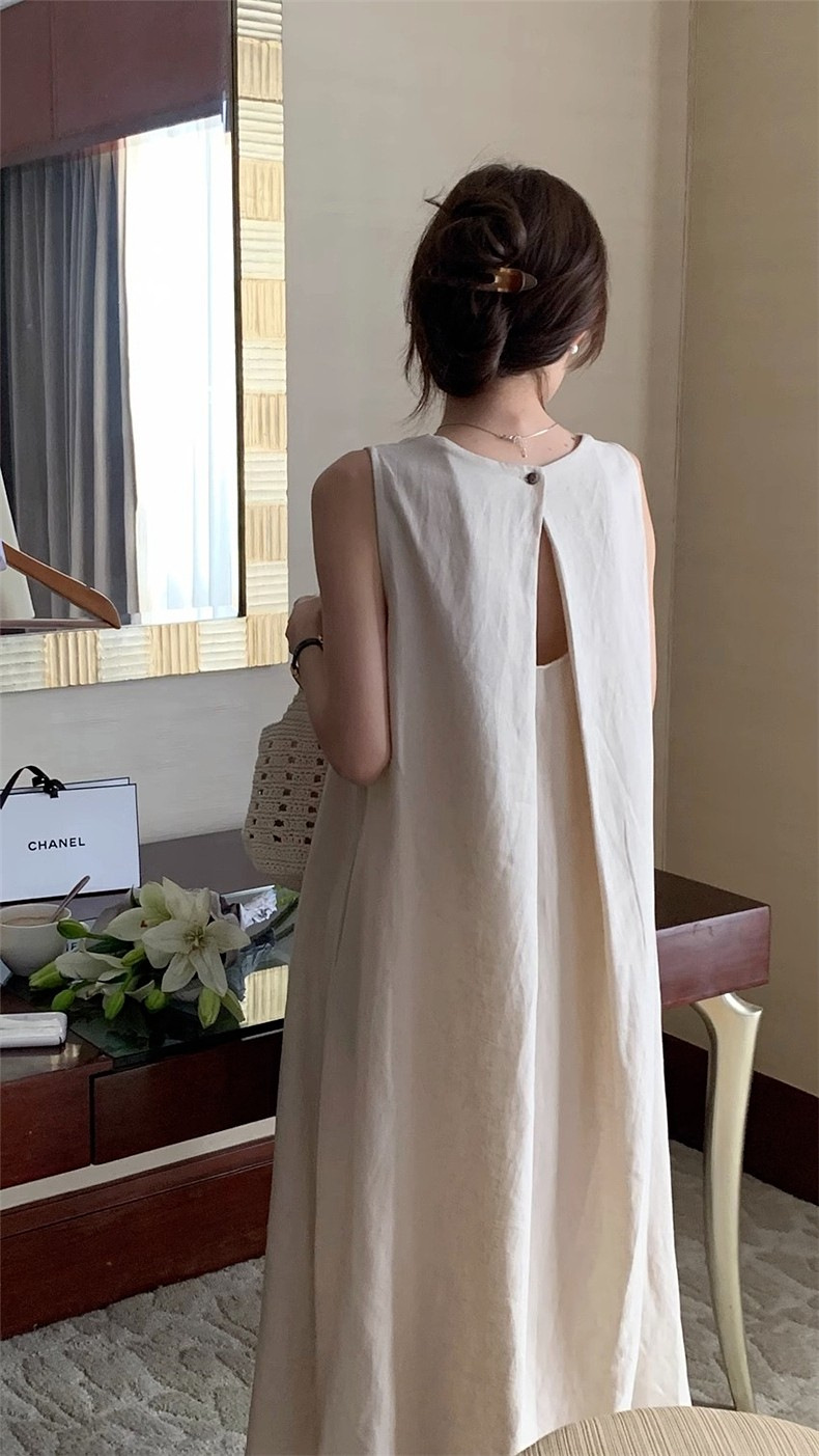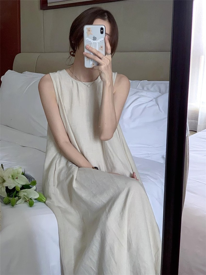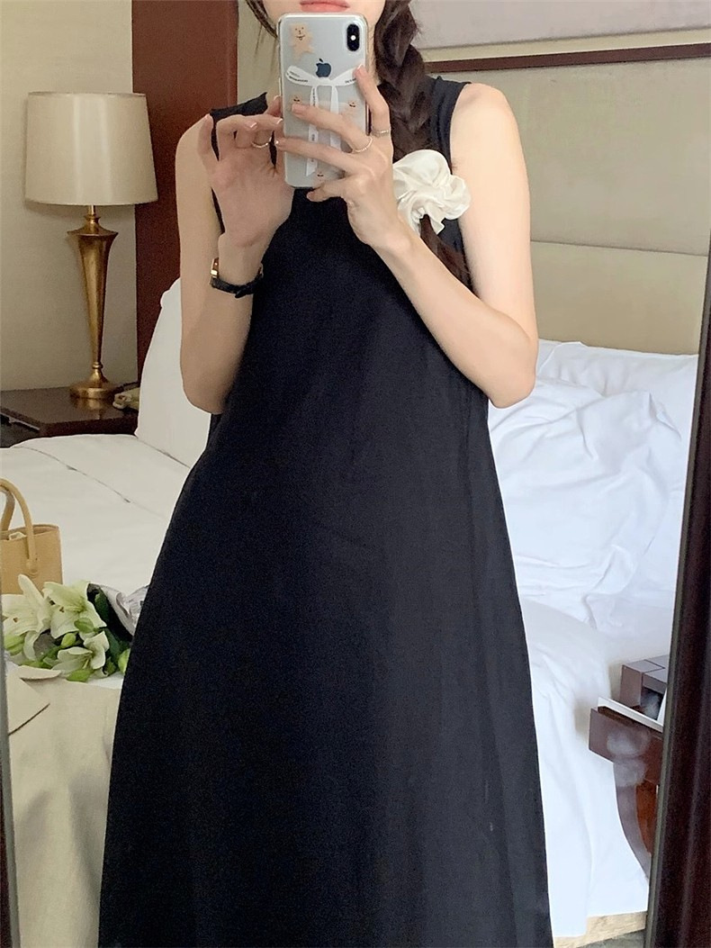 ノースリーブチョッキのワンピースの中の長さの純色はお腹を隠します。