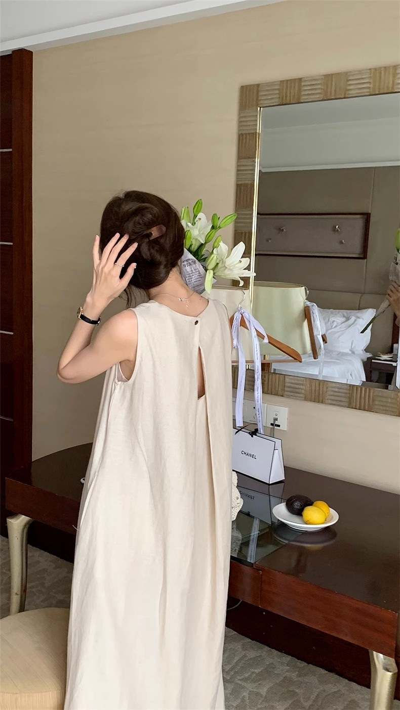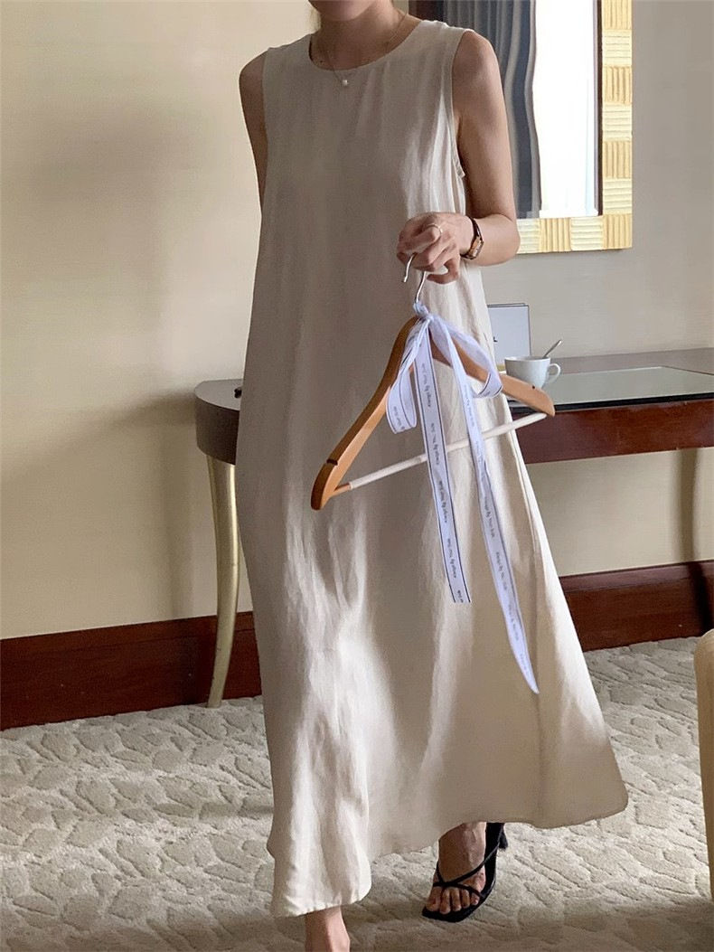 ソリッドカラールーズノースリーブベストドレス夏のホルターネックバックレースアップ中空ロングスカートヘップバーンスタイルドレス女性用